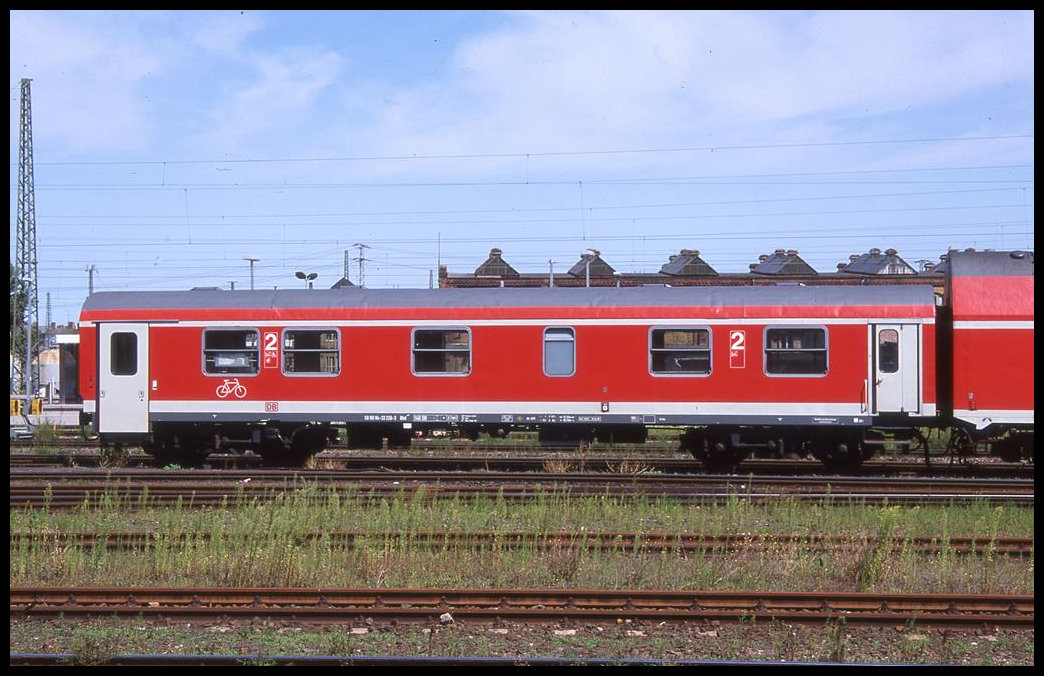Aus einem ehemaligen DR Wagen wurde ein DB Fahrrad Transportwagen in moderner roter Lackierung mit der Bezeichnung 509004-53226-3 Bbd; gesehen am 9.8.1998 im HBF Halle an der Saale.