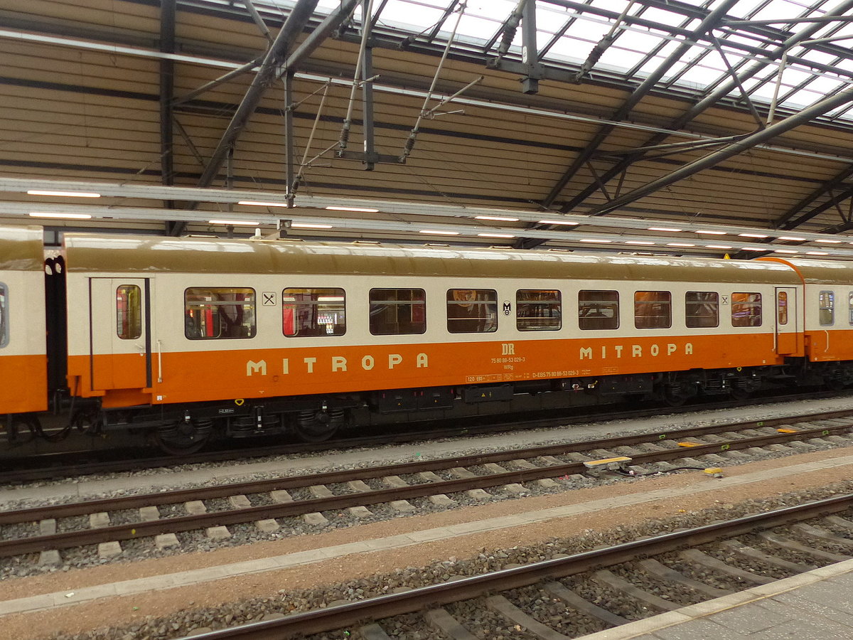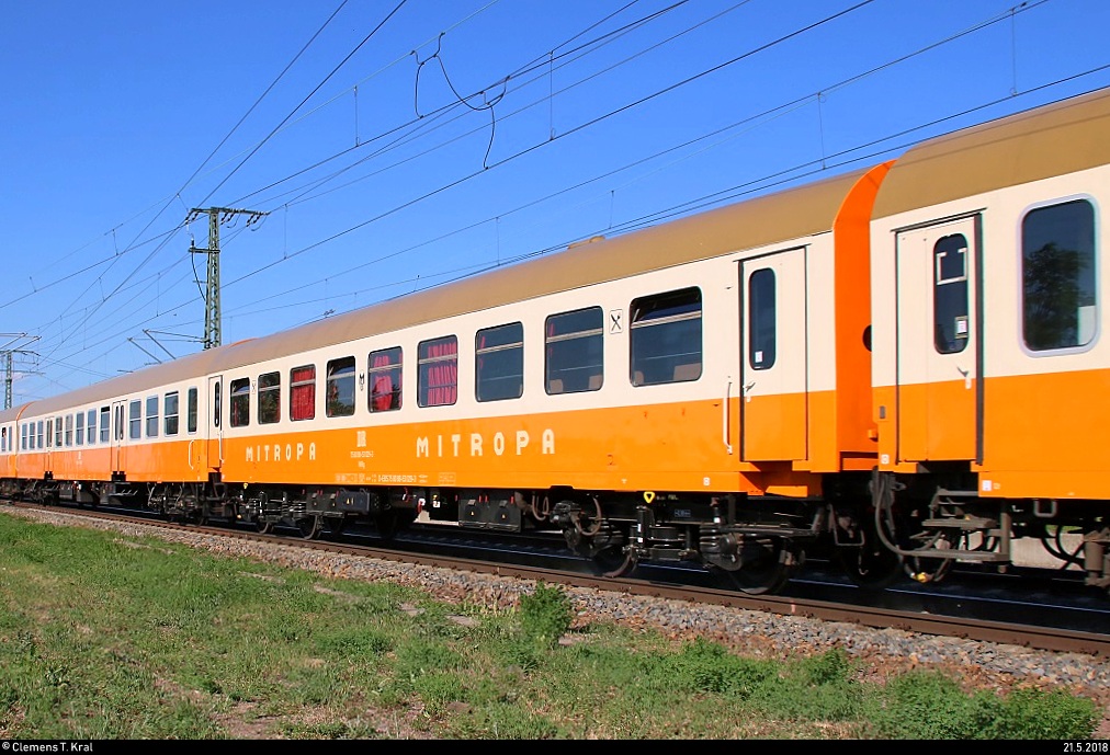 Blick auf einen MITROPA-Speisewagen der Gattung "WRm 130.1" (75 80 88 85 003-0 D-DME) der Dampf-Plus GmbH, der im SDZ 56744 von Naumburg(Saale)Hbf nach Warnemünde mit 18 201 der Dampf-Plus GmbH und 143 005-7 (243 005-6) der Traditionsgemeinschaft Bw Halle P e.V. eingereiht ist und Halle(Saale)Hbf auf Gleis 9 verlässt.