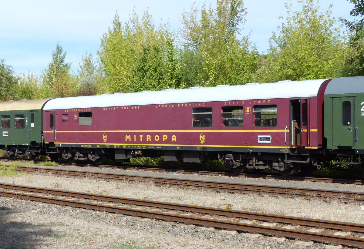 Blick auf ein Wagenende eines MITROPA-Speisewagens (derzeit ohne UIC-Nummer) der Traditionsgemeinschaft Bw Halle P e.V., der im Ringlokschuppen ausgestellt ist.