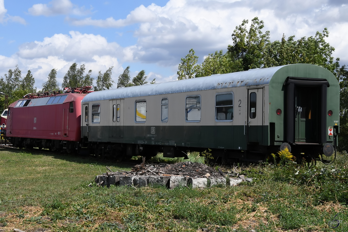 Blick auf einen Schnellzugwagen "ABme" Typ Y (56 80 39-40 043-3 D-EMBB | ex DR 51 50 39-40 043-4) des Verein Eisenbahnmuseum Bayerischer Bahnhof zu Leipzig e.V., der im Eisenbahnmuseum Leipzig-Plagwitz steht. [5.5.2018 | 20:03 Uhr] Clemens Kral