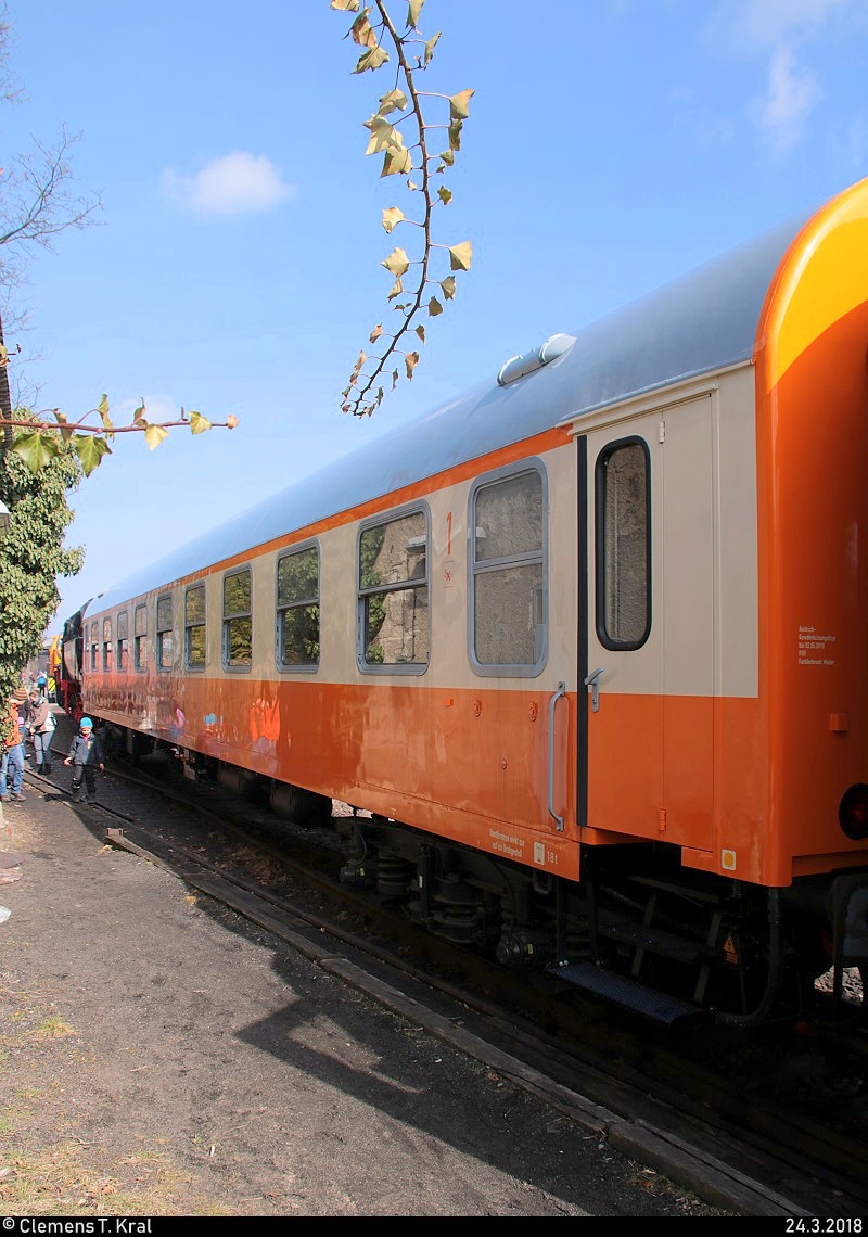 Nachschuss auf den Sonderzug auf seiner Rückfahrt von Staßfurt nach Leipzig-Plagwitz mit Zuglok 35 1097-1 des Verein Eisenbahnmuseum Bayerischer Bahnhof zu Leipzig e.V. anlässlich des Eisenbahnfests, der in Schkeuditz West auf der Bahnstrecke Magdeburg–Leipzig (KBS 340) fährt. Am Zugschluss hängt ein Personenwagen "Am 201" (56 80 10-40 203-6 D-IGEW) des IGE Werrabahn Eisenach e.V. [25.3.2018 | 18:04 Uhr] Clemens Kral