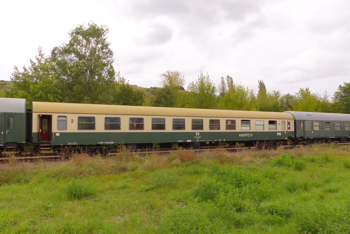 Blick auf einen Schnellzugwagen Buffet Typ X "Bmk" (56 80 85-45 009-2 D-EMBB | ex DR 51 50 85-45 009-3) des Verein Eisenbahnmuseum Bayerischer Bahnhof zu Leipzig e.V., der im Eisenbahnmuseum Leipzig-Plagwitz steht. [5.5.2018 | 19:57 Uhr] Clemens Kral