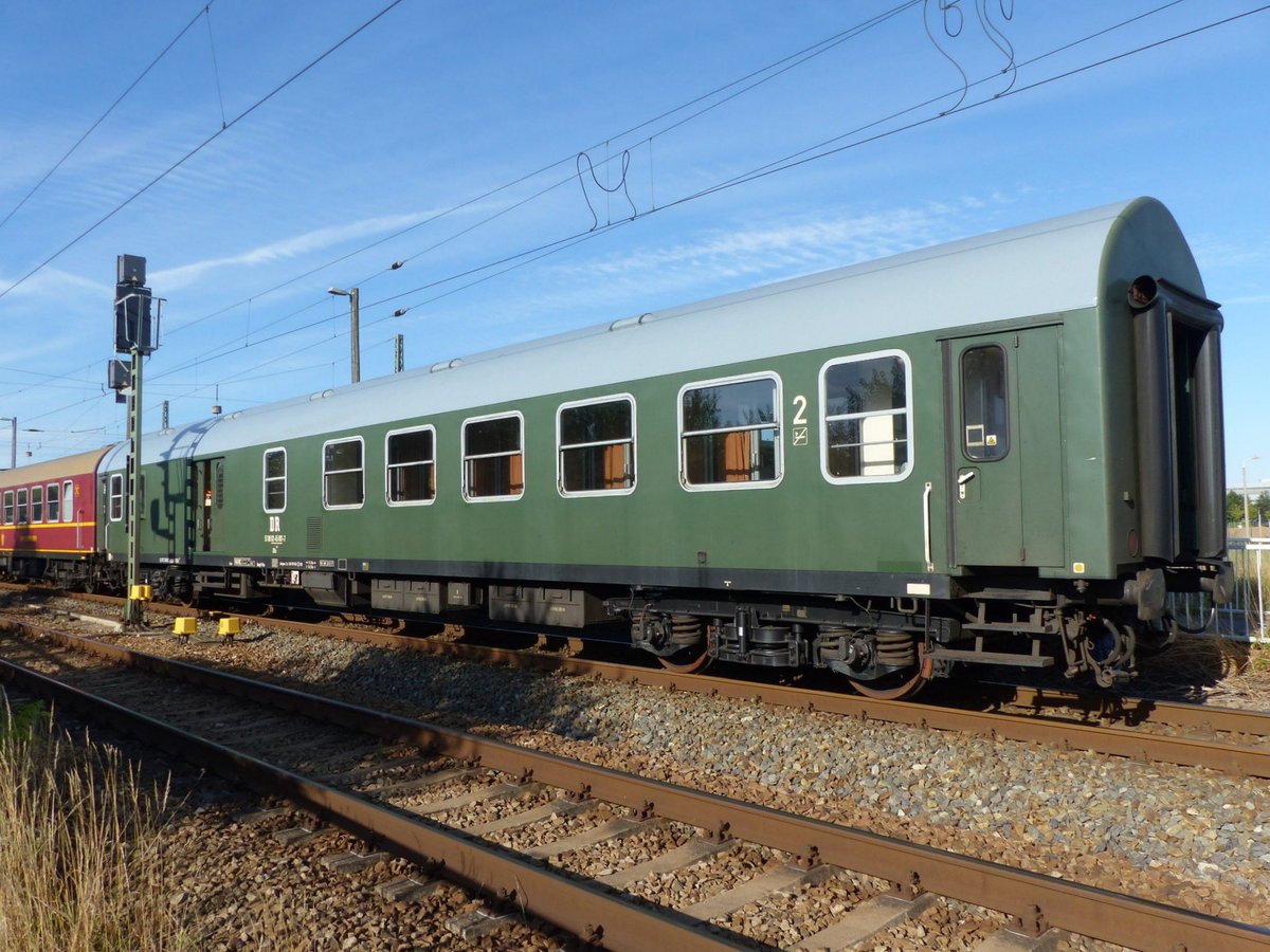Blick auf einen ex DR Salonwagen (61 50 99-10 377-7), der im Eisenbahnmuseum Leipzig-Plagwitz des Verein Eisenbahnmuseum Bayerischer Bahnhof zu Leipzig e.V. steht. [5.5.2018 | 19:51 Uhr] Clemens Kral