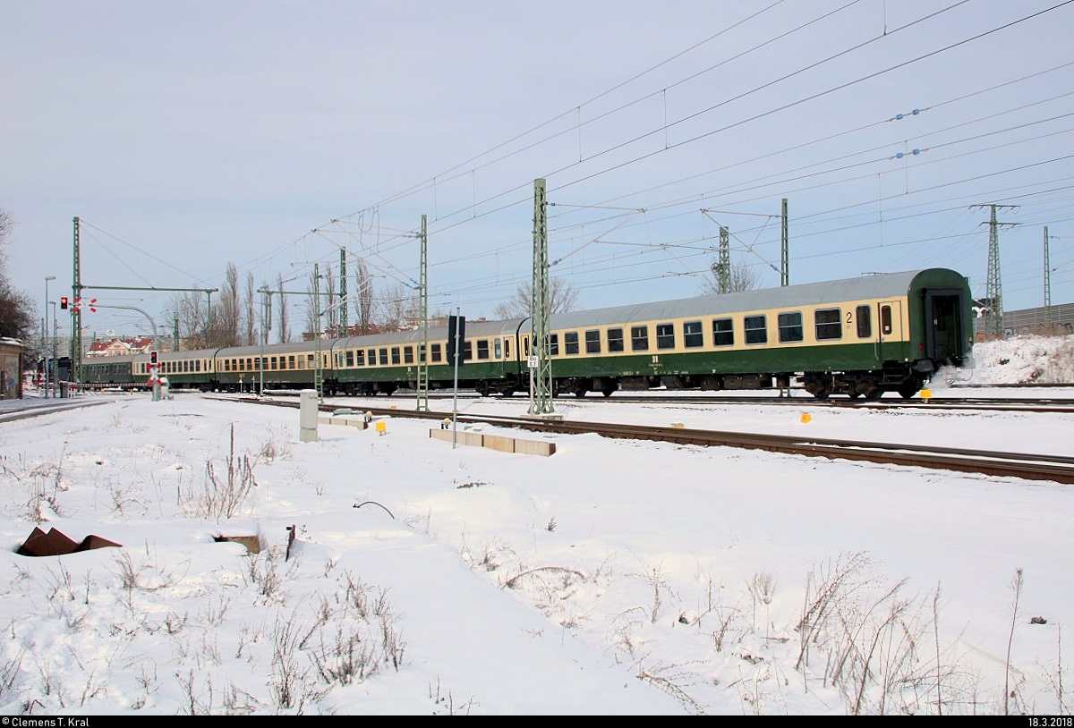 Nachschuss auf ehemalige DR-Personenwagen des IGE Werrabahn Eisenach e.V. mit Zuglok 41 1144-9 als verspäteter Halloren-Express von Greiz nach Halle(Saale)Hbf, der in Halle (Saale), Karl-von-Thielen-Straße, auf der Ostumfahrung für den Güterverkehr fährt. [18.3.2018 | 12:11 Uhr] Clemens Kral