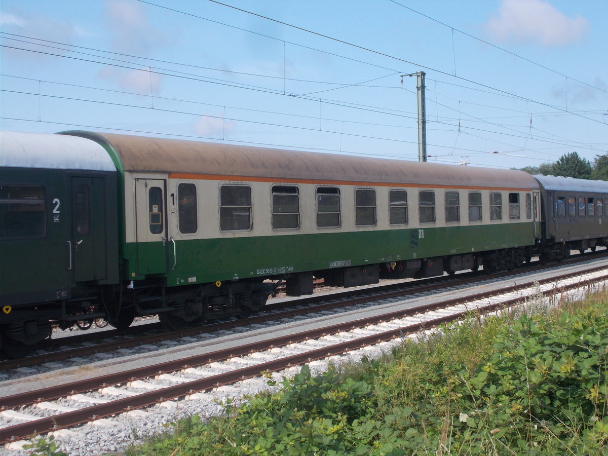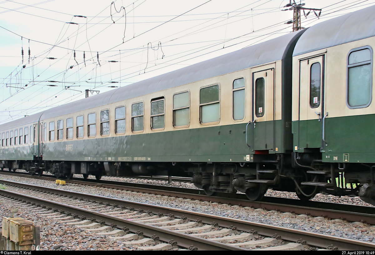 Blick auf einen Buffetwagen der Gattung "Bomk" (56 80 85-40 007-1 D-IGEW) der IGE Werrabahn Eisenach e.V., der im MDV-Sonderzug von Meiningen nach Leipzig Hbf mit 232 334-3 (132 334-4) der Erfurter Bahnservice GmbH (EBS) eingereiht ist und in Großkorbetha auf der Bahnstrecke Halle–Bebra (KBS 580) fährt.