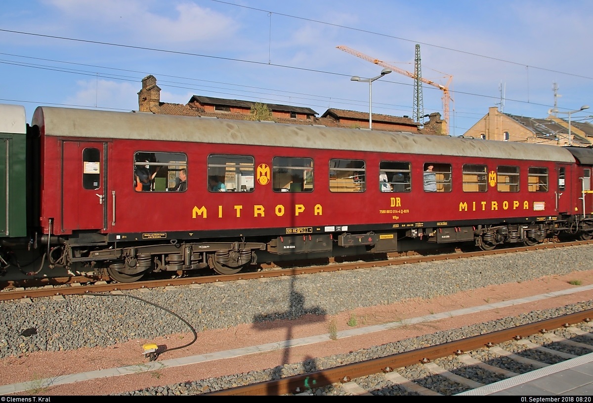 Blick auf einen MITROPA-Speisewagen der Gattung "WRge" (75 80 8813 014-4 D-DLFB) der Dampflokfreunde Berlin e.V., der in DPE 20161 von Berlin-Schöneweide nach Meiningen mit 232 333-5 der Wedler Franz Logisik GmbH & Co. KG (WFL) anlässlich der 24. Meininger Dampfloktage eingereiht ist und Halle(Saale)Hbf auf Gleis 9 verlässt.