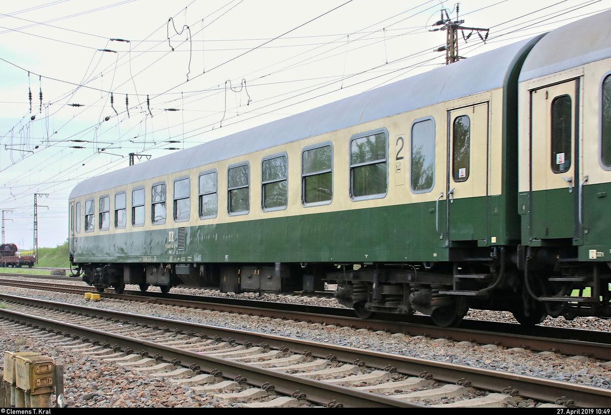 Blick auf einen UIC-Z-Wagen (DR) der Gattung "Bom 280.1" (51 80 21-50 147-4) von DB Regio Südost, der im MDV-Sonderzug von Meiningen nach Leipzig Hbf mit 232 334-3 (132 334-4) der Erfurter Bahnservice GmbH (EBS) eingereiht ist und in Großkorbetha auf der Bahnstrecke Halle–Bebra (KBS 580) fährt.