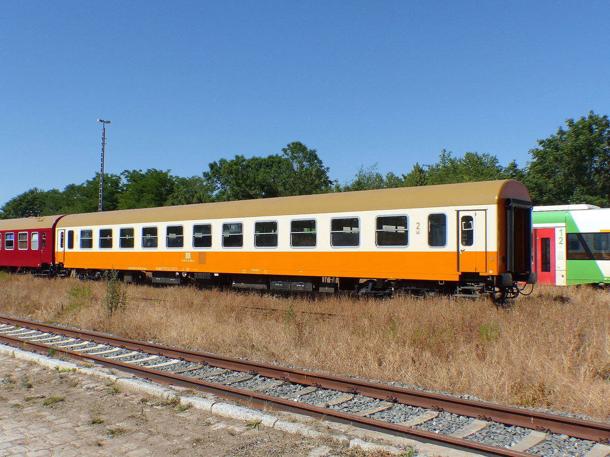Blick auf einen UIC-Z-Wagen (DR) der Gattung "Bom 024" (56 80 21-80 090-5 D-PRESS) der Eisenbahn-Bau- und Betriebsgesellschaft Pressnitztalbahn mbH (PRESS), der im SDZ 56744 von Naumburg(Saale)Hbf nach Warnemünde mit 18 201 der Dampf-Plus GmbH und 143 005-7 (243 005-6) der Traditionsgemeinschaft Bw Halle P e.V. eingereiht ist und Halle(Saale)Hbf auf Gleis 9 verlässt.