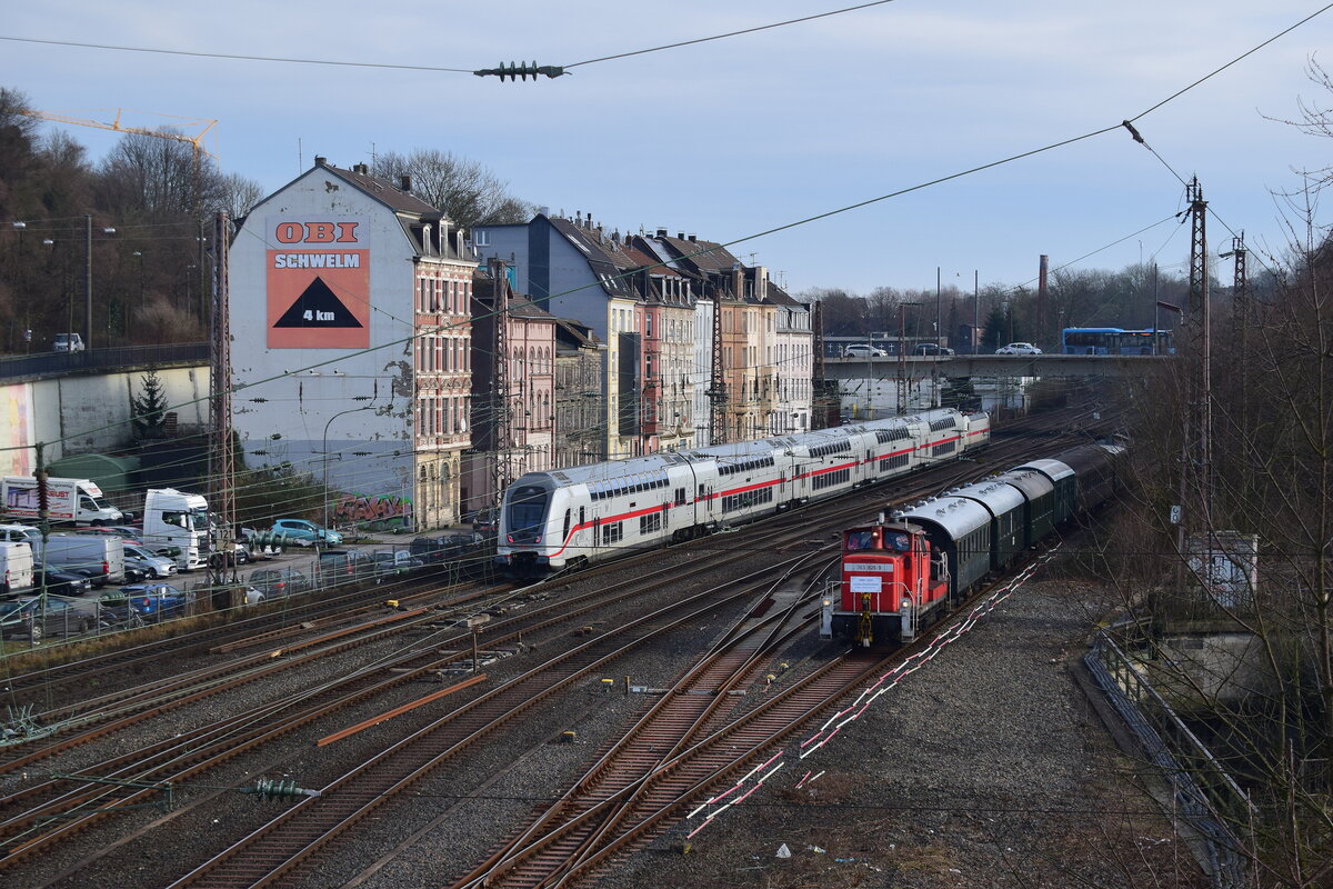 Treffen der Generationen. Knappe 60Jahren liegen zwsichen dem ausfahrenden IC2 und der aus Beyenburg kommenden 363 826-9. Hier treffen sie sich im Bahnhof Wuppertal Oberbarmen. Am 8.2.25 fuhr das erste mal seit 45 Jahren wieder ein Personenzug nach Beyenburg. Der Andrang war groß.