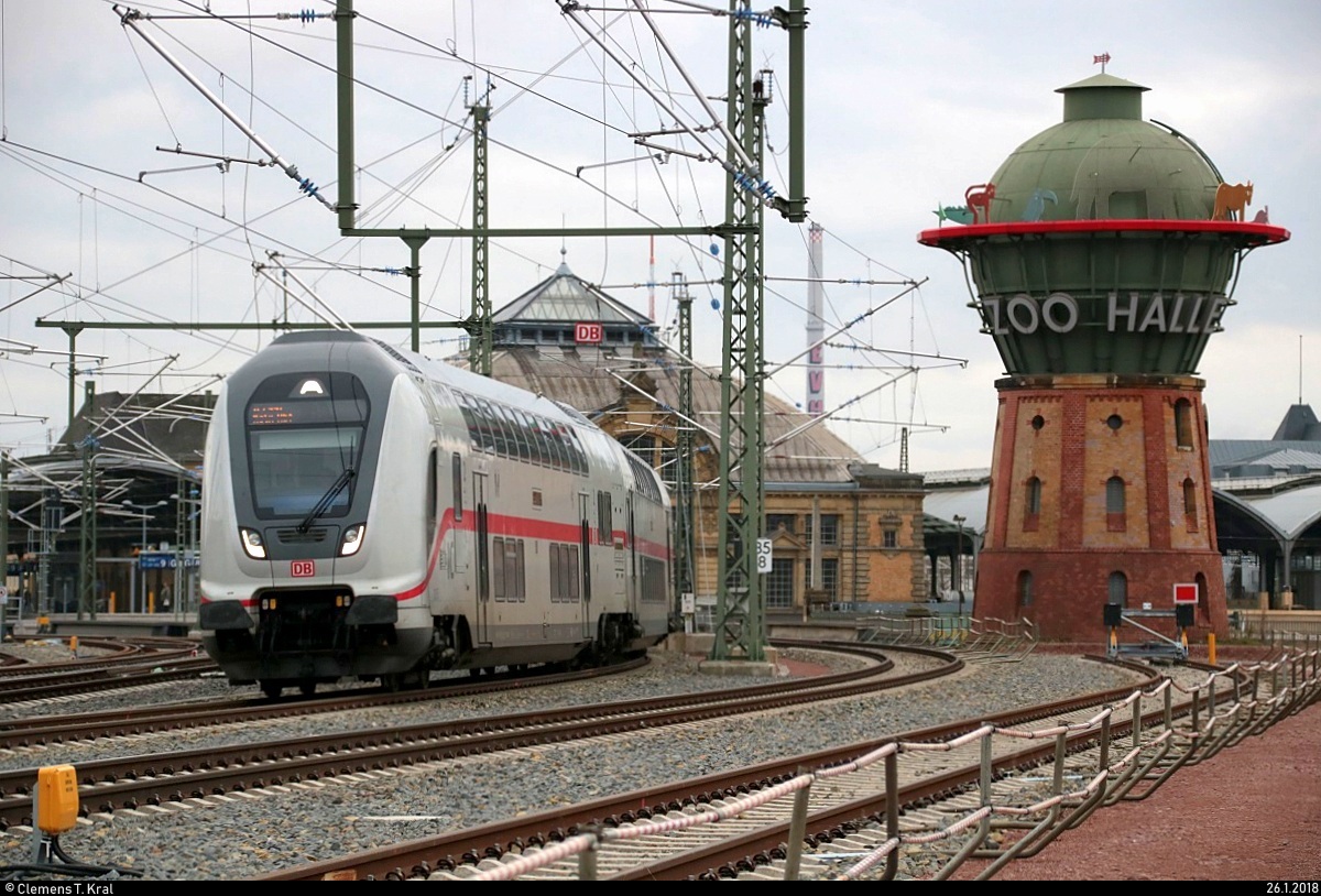 DBpbzfa mit Schublok 146 557-4 DB als IC 2542 (Linie 55) von Dresden Hbf nach Hannover Hbf verlässt mit Fahrtbegriff "Zs 1" (Ersatzsignal) Halle(Saale)Hbf auf Gleis 9. [27.12.2017 | 15:13 Uhr] Clemens Kral