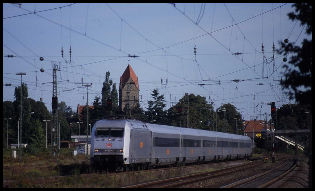 Am 9.9.2004 verkehrte noch der Metropolitan auf der Rollbahn. Um 17.10 Uhr kommt hier 101131 auf der Fahrt nach Hamburg durch den Bahnhof Lengerich in Westfalen. Gerd Hahn