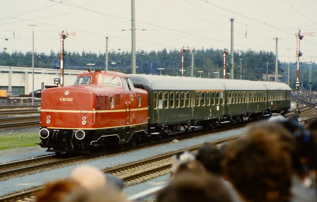 V 80 002 mit Eilzug auf der Fahrzeugparade "Vom Adler bis in die Gegenwart", die im September 1985 an mehreren Wochenenden in Nürnberg-Langwasser zum 150jährigen Jubiläum der Eisenbahn in Deutschland stattgefunden hat. Manfred Kopka