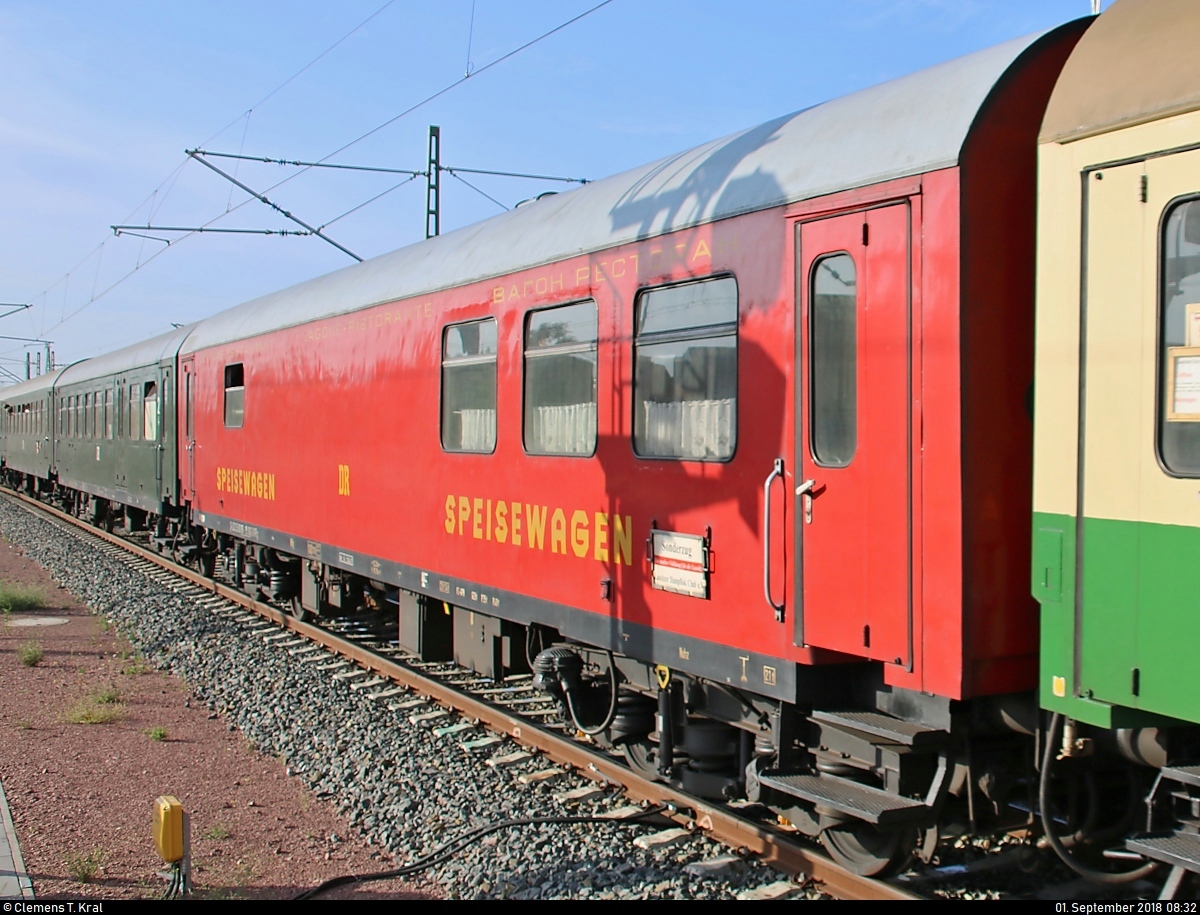 Blick auf einen Buffetwagen der Gattung "WRg" (55 80 88-15 100-3 D-LDC) des Lausitzer Dampflok Club e.V., der in DPE 20397 von Cottbus nach Meiningen mit 18 201 der Dampf-Plus GmbH und 232 601-5 der Wedler Franz Logisik GmbH & Co. KG (WFL) anlässlich ihrer letzten Fahrt bzw. der 24. Meininger Dampfloktage eingereiht ist und Halle(Saale)Hbf auf Gleis 10 verlässt. [1.9.2018 | 8:32 Uhr]