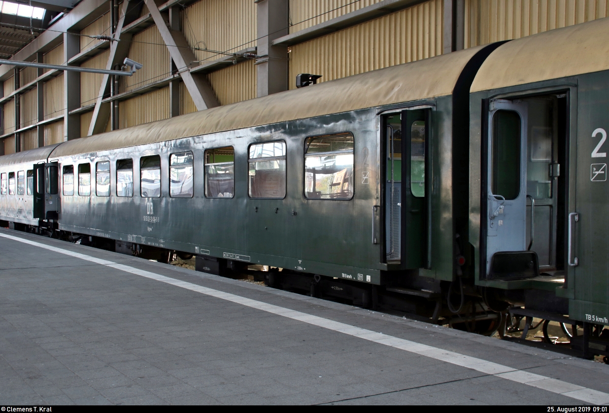 Blick auf einen Reko-Wagen (DR) der Gattung "Bghw 022" (55 80 28-13 456-4 D-SEM | DR 50 50 28-13 456-5). Dieser ist anlässlich der zweiten Parallelfahrt zwischen Flöha und Freiberg(Sachs) im Rahmen des 28. Heizhausfests des Sächsischen Eisenbahnmuseum Chemnitz-Hilbersdorf e.V. (SEM) in Parallelzug 2 nach Freiberg(Sachs) mit 50 3648-8 des SEM und E 77 10 der Interessengemeinschaft Bw Dresden Altstadt e.V. im Startbahnhof Chemnitz Hbf auf Gleis 14 eingereiht. [25.8.2019 | 9:01 Uhr]