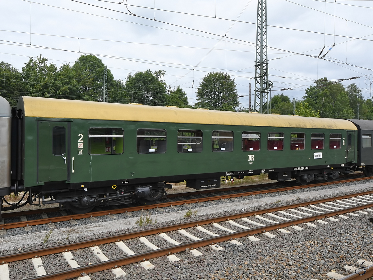 Blick auf einen Reko-Wagen (DR) der Gattung  Bghw  (NVR-Nummer nicht ablesbar) der Eisenbahnfreunde Traditionsbahnbetriebswerk Staßfurt e.V., der in einem Sonderzug von Magdeburg Hbf nach Erfurt Hbf mit 228 757-1 (118 757-4 | DR V 180) der Eisenbahn-Bau- und Betriebsgesellschaft Pressnitztalbahn mbH (PRESS) eingereiht ist und im Bahnhof Sandersleben(Anh) auf Gleis ? steht.