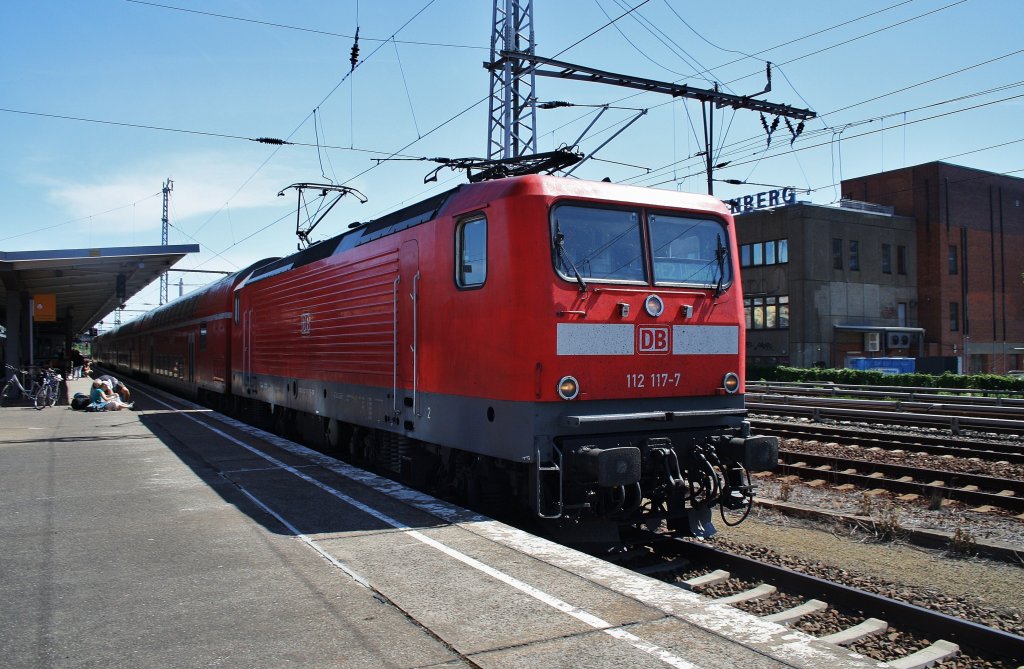 Hier 112 117-7 mit einem RE2 (RE37378) von Cottbus nach Wismar, bei der Ausfahrt am 26.5.2012 aus Berlin Lichtenberg.