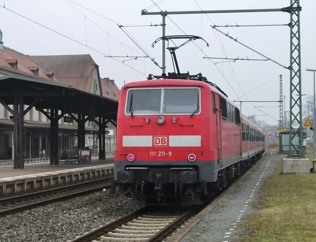 111 211-9 fährt am 18.11.2011 mit einer Regionalbahn nach Pressig-Rothenkirchen in Kronach auf Gleis 1 ein. Das besondere daran ist, dass normalerweiße nur eine BR 143 mit 3 n-Wagen oder eine BR 612 als Regionalbahn fahren. Ab und zu kommt auch mal eine BR 111 in den nördlichen Frankenwald. Alexander