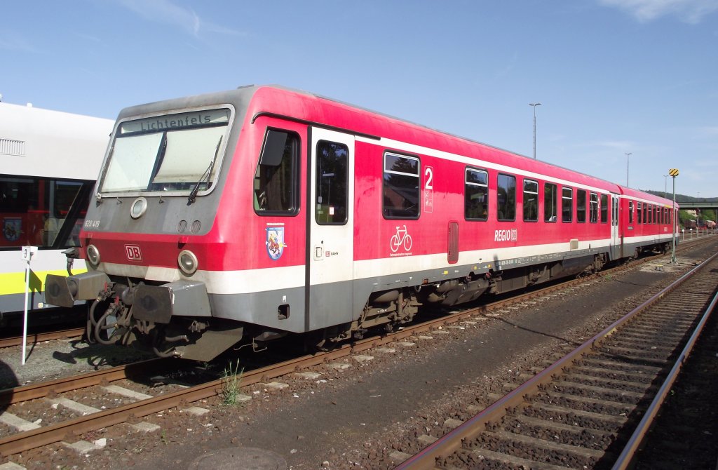 612 615 "Landkreis Kronach" erreicht am 7. Mai 2011 als RE nach Neuenmarkt-Wirsberg den Bahnhof Münchberg auf Gleis 2. Auf Gleis 1 steht noch 628 245 als RB nach Helmbrechts. Frankenwaldbahner