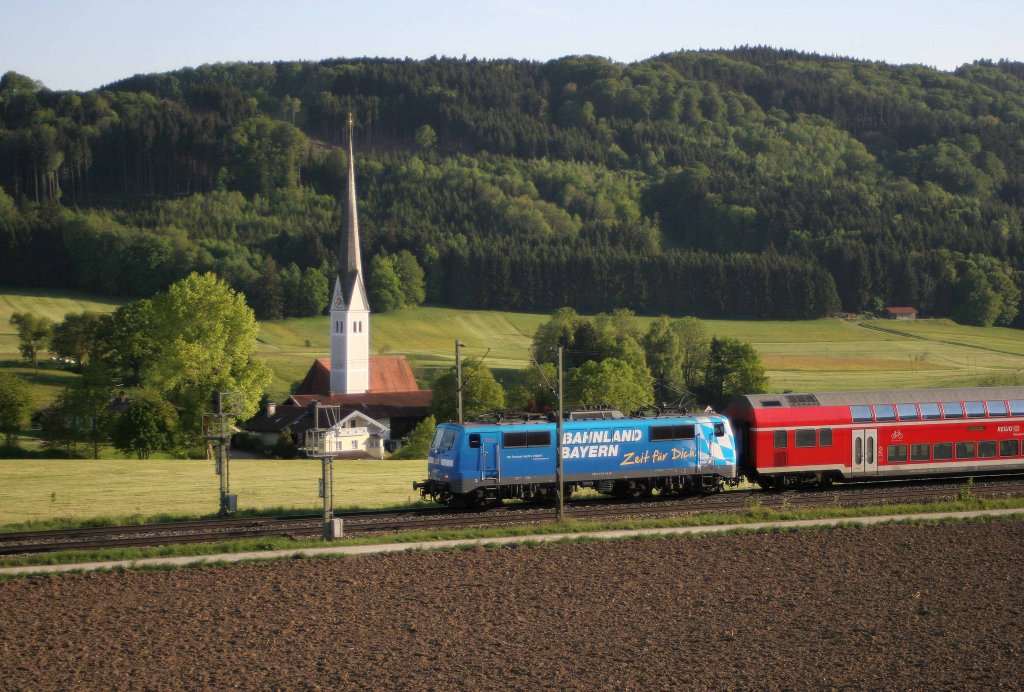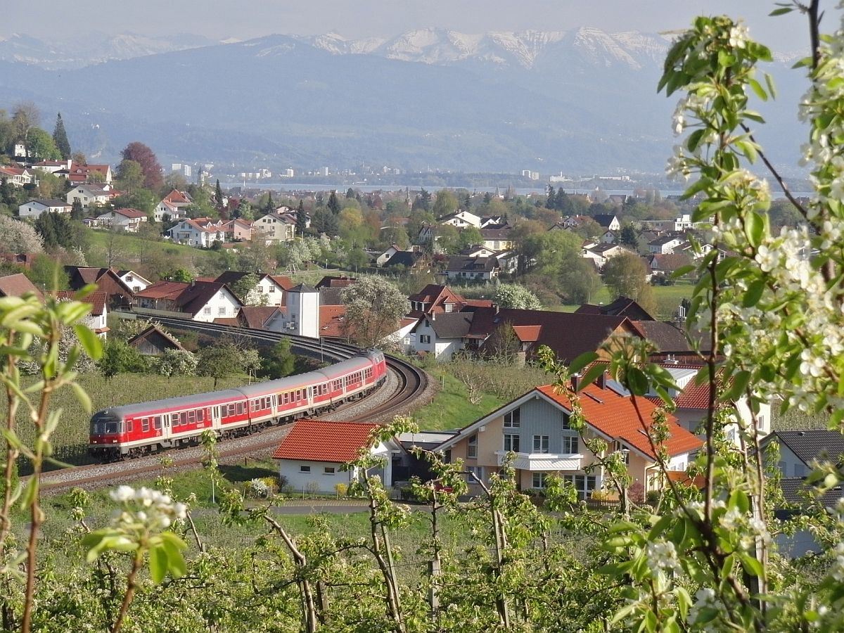 Mit Blick auf den Bodensee und die österreichischen Berge wurde vom Herrmannsberg bei Bodolz am 17.04.2011 RB 57549 von Lindau nach Augsburg fotografiert. Jürgen Vos