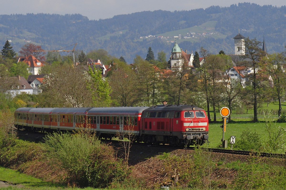 218 438-0 mit IRE 4212 von Lindau nach Ulm hat am 17.04.2011 kurz vorher den Haltepunkt Lindau-Aeschach passiert. Obwohl die Lichtverhältnisse auf den Zug bezogen nicht optimal sind, habe ich mich entschlossen, dieses Bild zu veröffentlichen. Jürgen Vos
