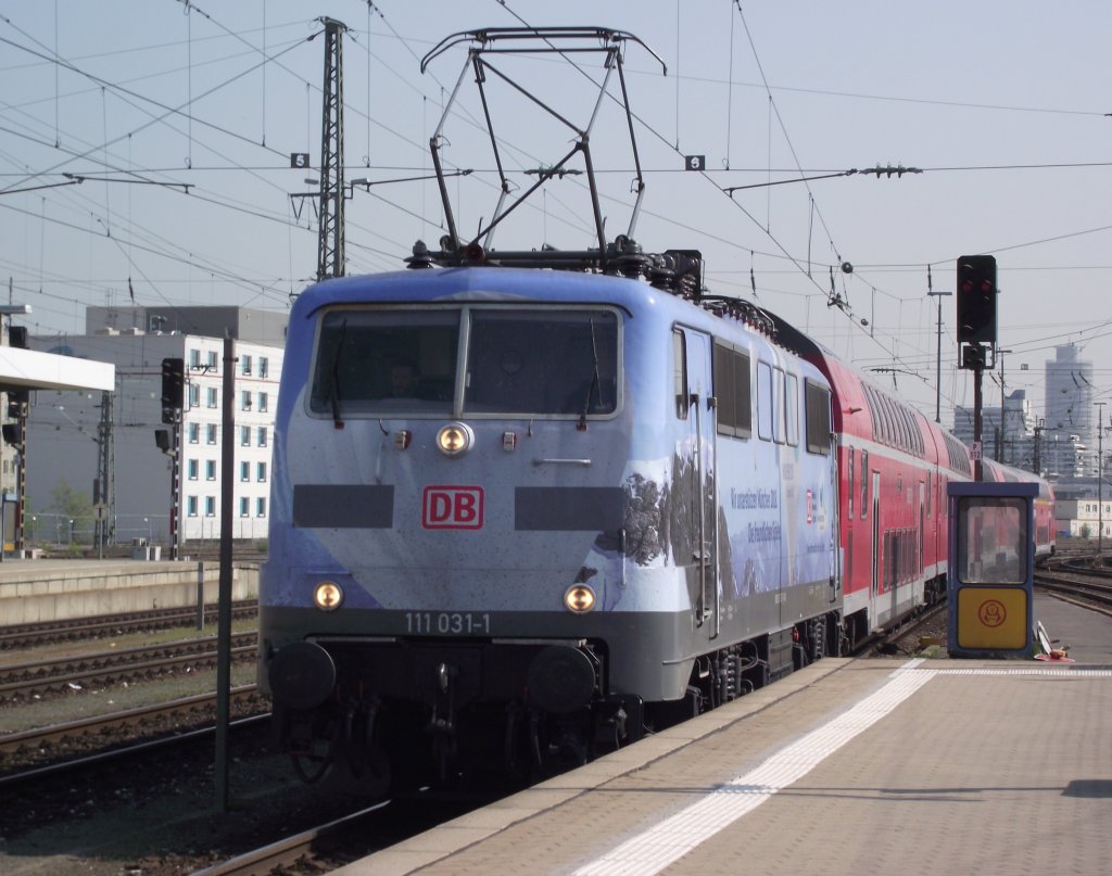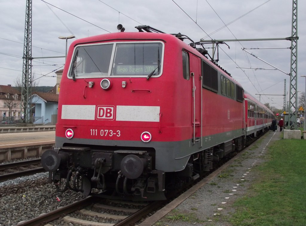 111 073-9 hat am 15. April 2011 soeben mit einem RE aus Nürnberg Hbf den Kronacher Bahnhofauf Gleis 4 erreicht. Man beachte die Zugzielanzeige und den Pantografen (die Lok schiebt). Frankenwaldbahner