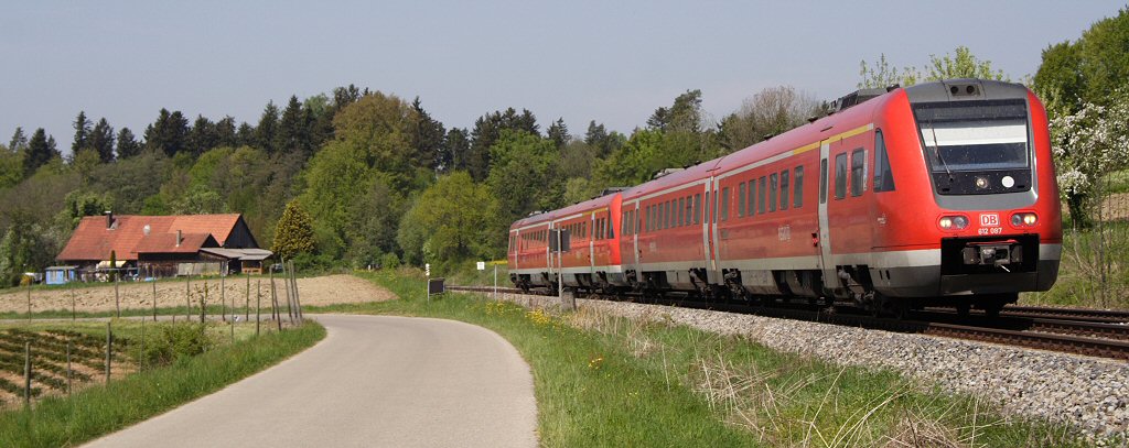 612 057 überholte am 29. April 2011 als RE nach Bayreuth gleich zwei Güterzüge in Kronach. Während rechts auf Gleis 1 ein Containerzug mit einer MRCE 185 wartet, steht links ein Schotterzug mit einer DB 152. Frankenwaldbahner