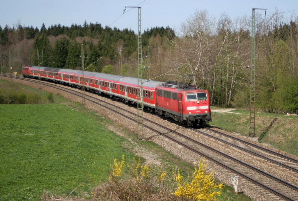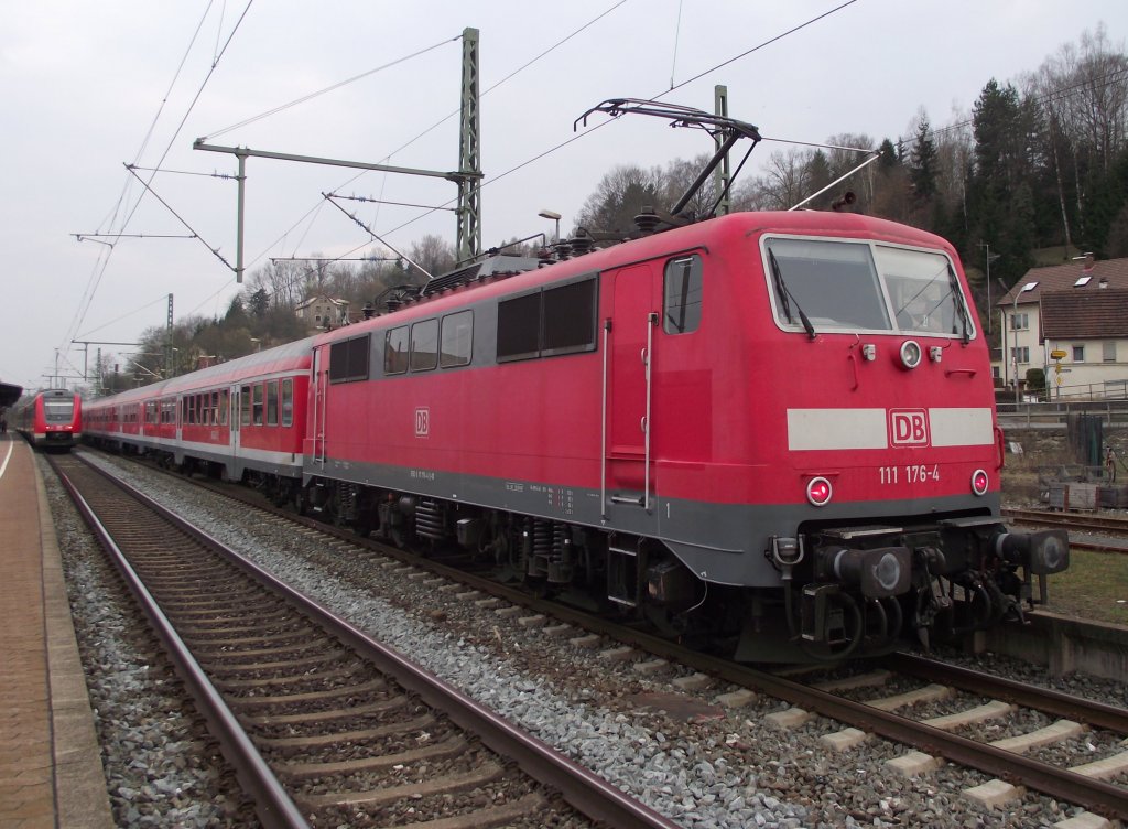 111 166-5 hängt am 13. April 2011 abgebügelt als Steuerwagenersatz am Zugschluss an einem RE/RB Nürnberg-Kronach. Die Aufnahme entstand nach der Ankunft des Zuges in Kronach. Frankenwaldbahner