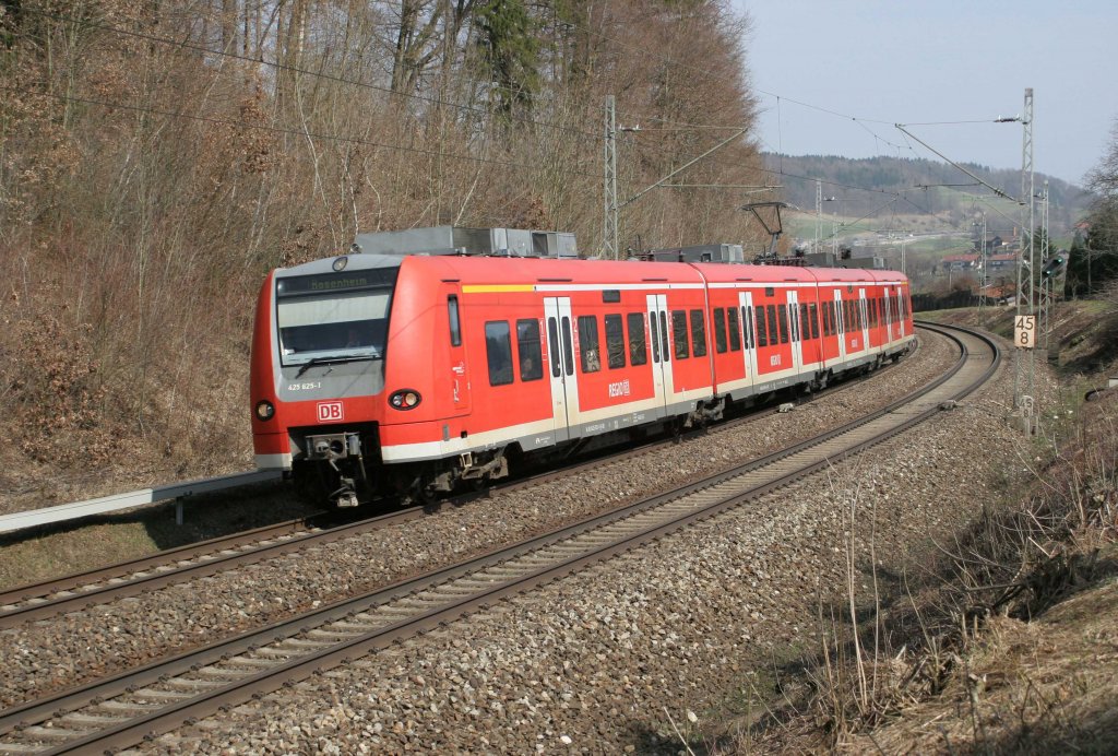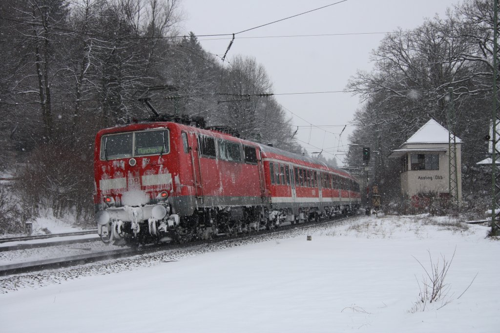 Eine Regionalbahn von Kronach nach Bamberg, bestehend aus 5n-Wagen und einer 111 als Schublok ist am 28. März 2011 auf der Frankenwaldbahn bei Neuses (bei Kronach) unterwegs. Frankenwaldbahner