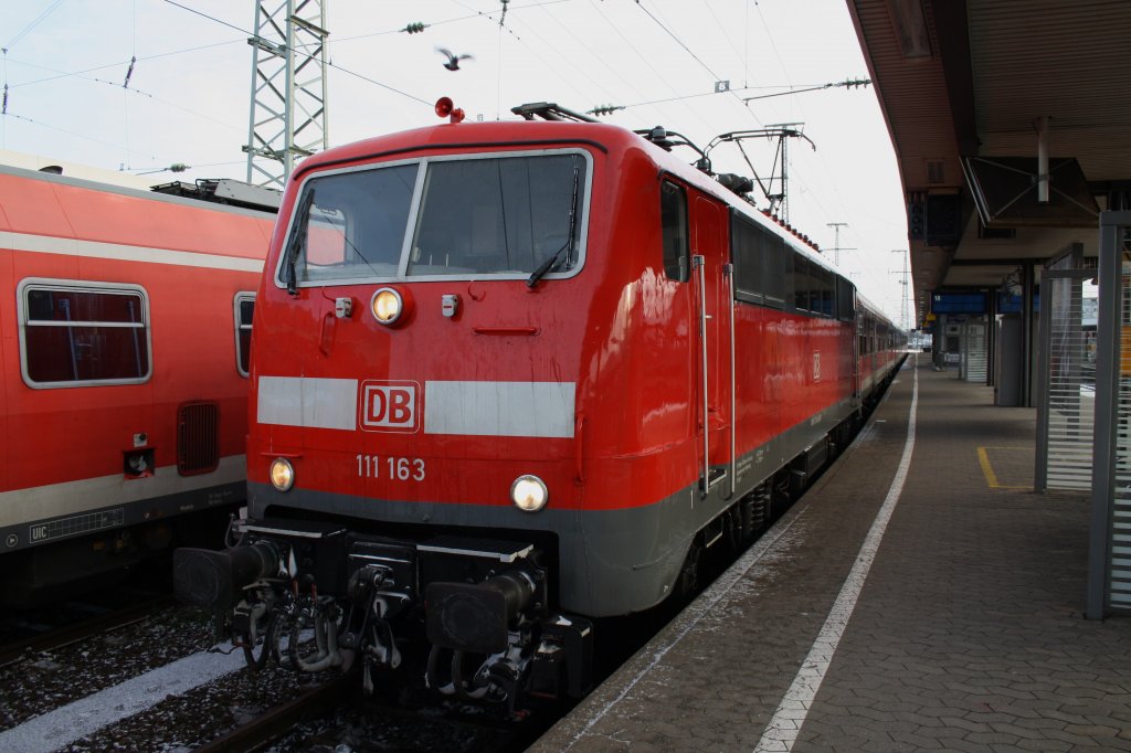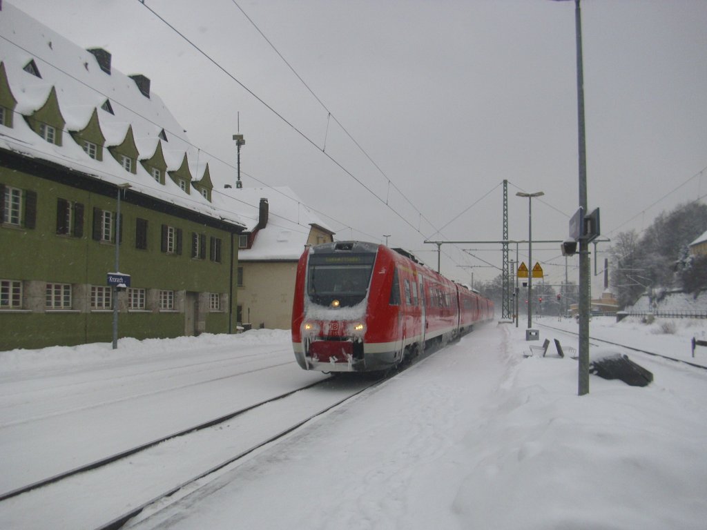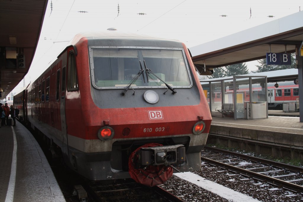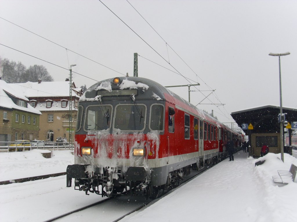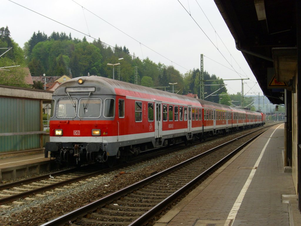 Eine n-Wagen Garnitur mit führendem Karlsruher Steuerwagen steht am 16. Mai 2010 zur Fahrt nach Lichtenfel auf Gleis 4 in Kronach bereit. Frankenwaldbahner