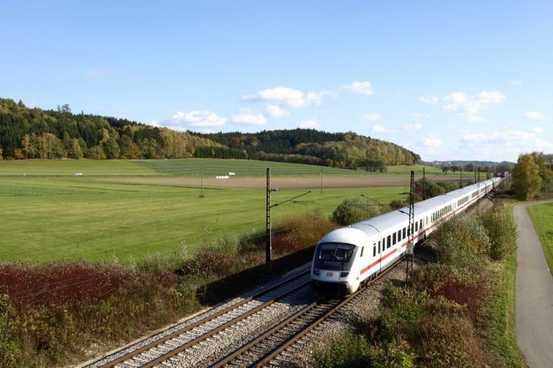 Ein IC in Richtung München fährt an einem sonnigen Montag, den 20.10.2008, von Ulm kommend, in Richtung München. Hier zwischen Offingen und Mindelaltheim, kommt ihm ein Doppelstock RE aus München entgegen.