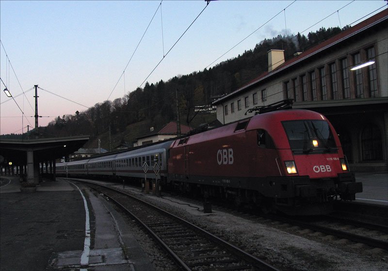 ÖBB 1116 186 fährt am späten Nachmittag des 26.10.2008 vor der Kulisse des Watzmann mit dem von Hamburg kommenden IC/RE 2083 in Berchtesgaden ein.