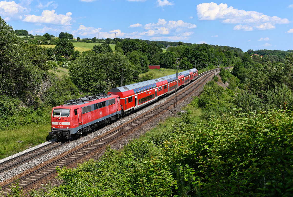 Etwas abgekämpft sah die 111 201 am 12. Juni 2022 aus, als ich sie vor dem RE 4858 nach Nürnberg HBF bei Laaber in der Oberpfalz aufnehmen konnte. Allerdings trug die Lok noch die Regenrinne über der Frontscheibe, diese haben die meisten ihrer Artgenossinnen schon eingebüßt. Die Züge der RE Linie 50 werden planmäßig von Loks der Baureihe 146 befördert, allerdings schwimmt nach wie vor mindestens eine 111 in den Umläufen mit.