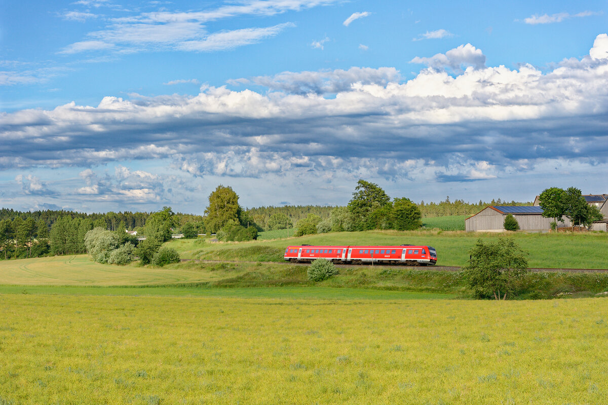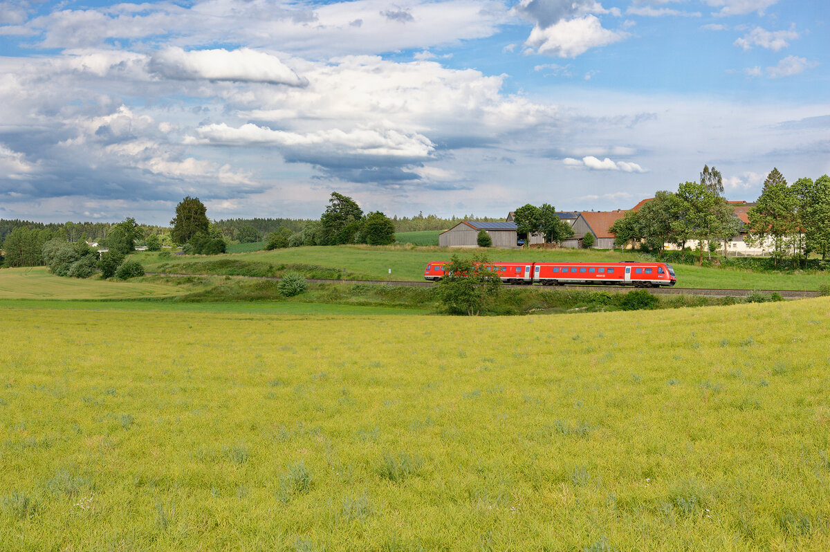 Der auf den Taufnamen "Treuchtlingen" hörende vierteilige ET445 Bombardier TWINDEXX Vario war am 14.5.2021 bei Asbach als RB16 unterwegs nach Nürnberg. Mario Rossi