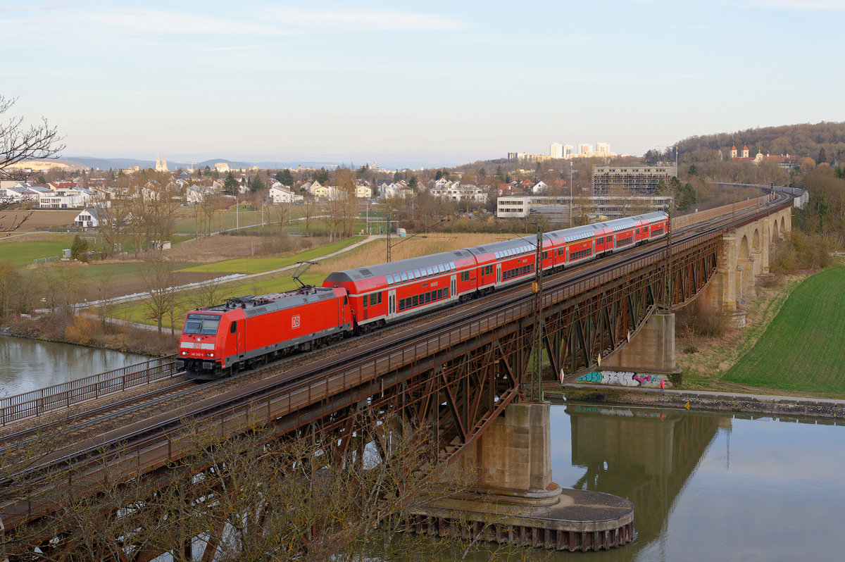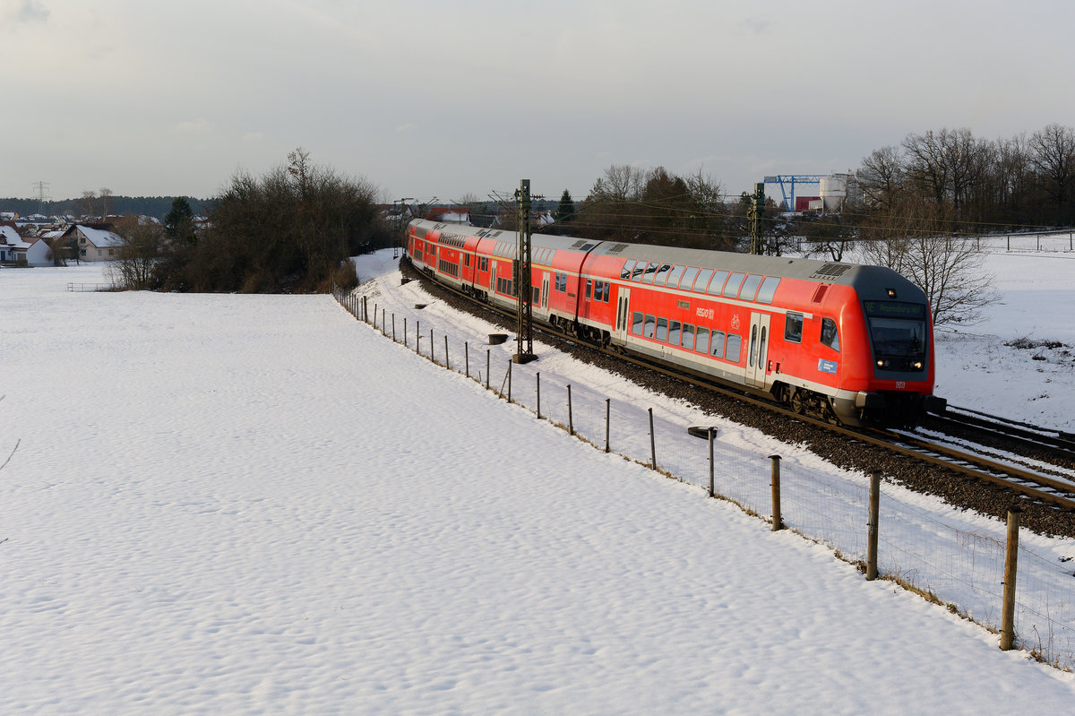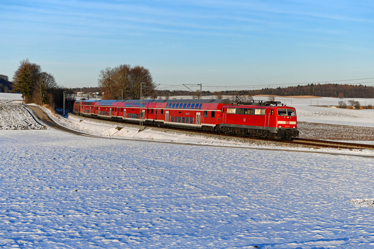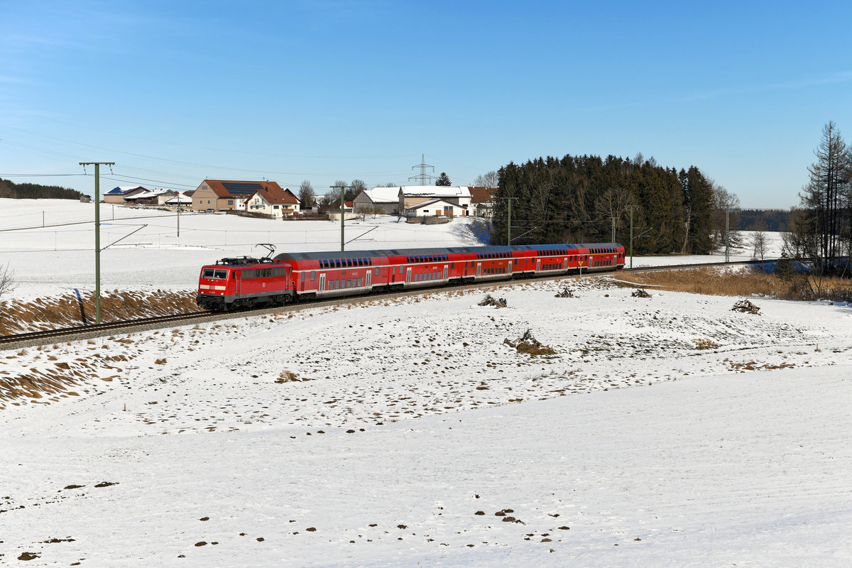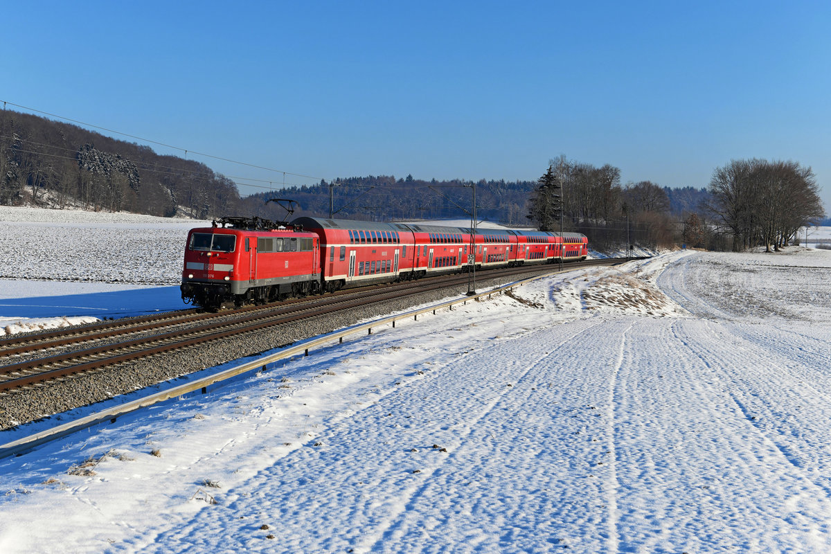 Ohne Kontrollziffer auf der Front ist 111 076 unterwegs. Hier ist sie am 14. Februar 2021 bei Kottgeisering mit dem RE 57426 auf der Fahrt von München HBF nach Memmingen zu sehen. Christoph Schneider