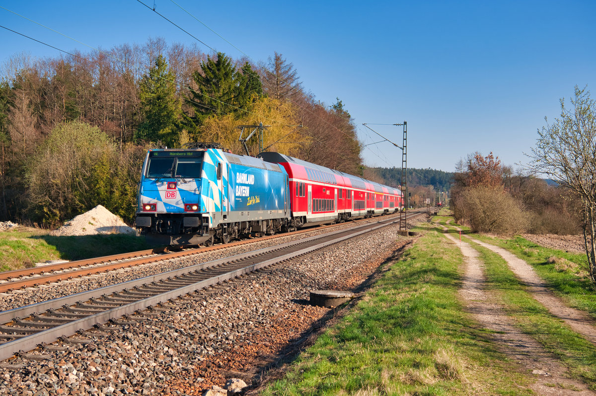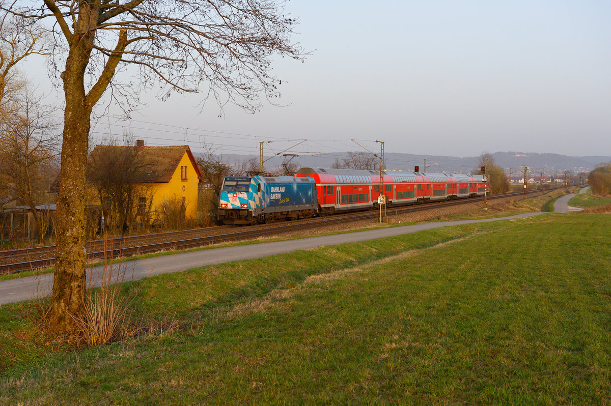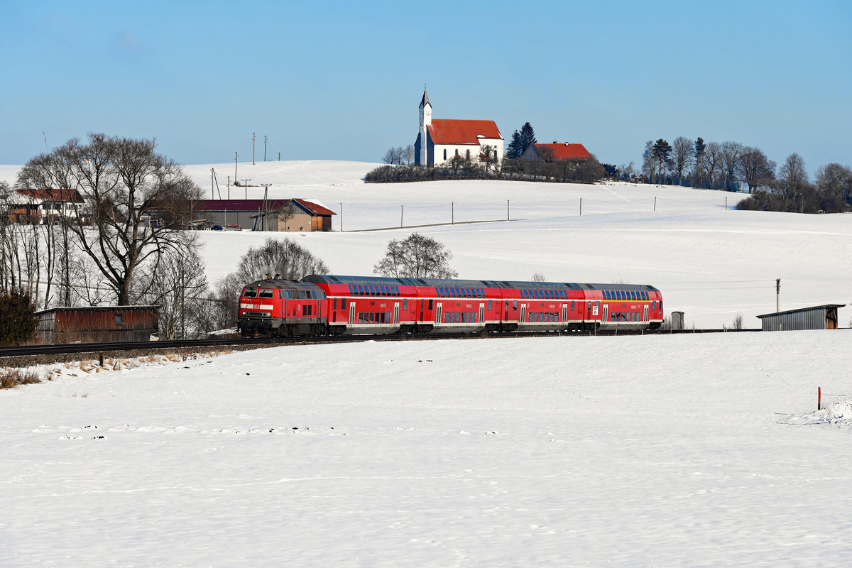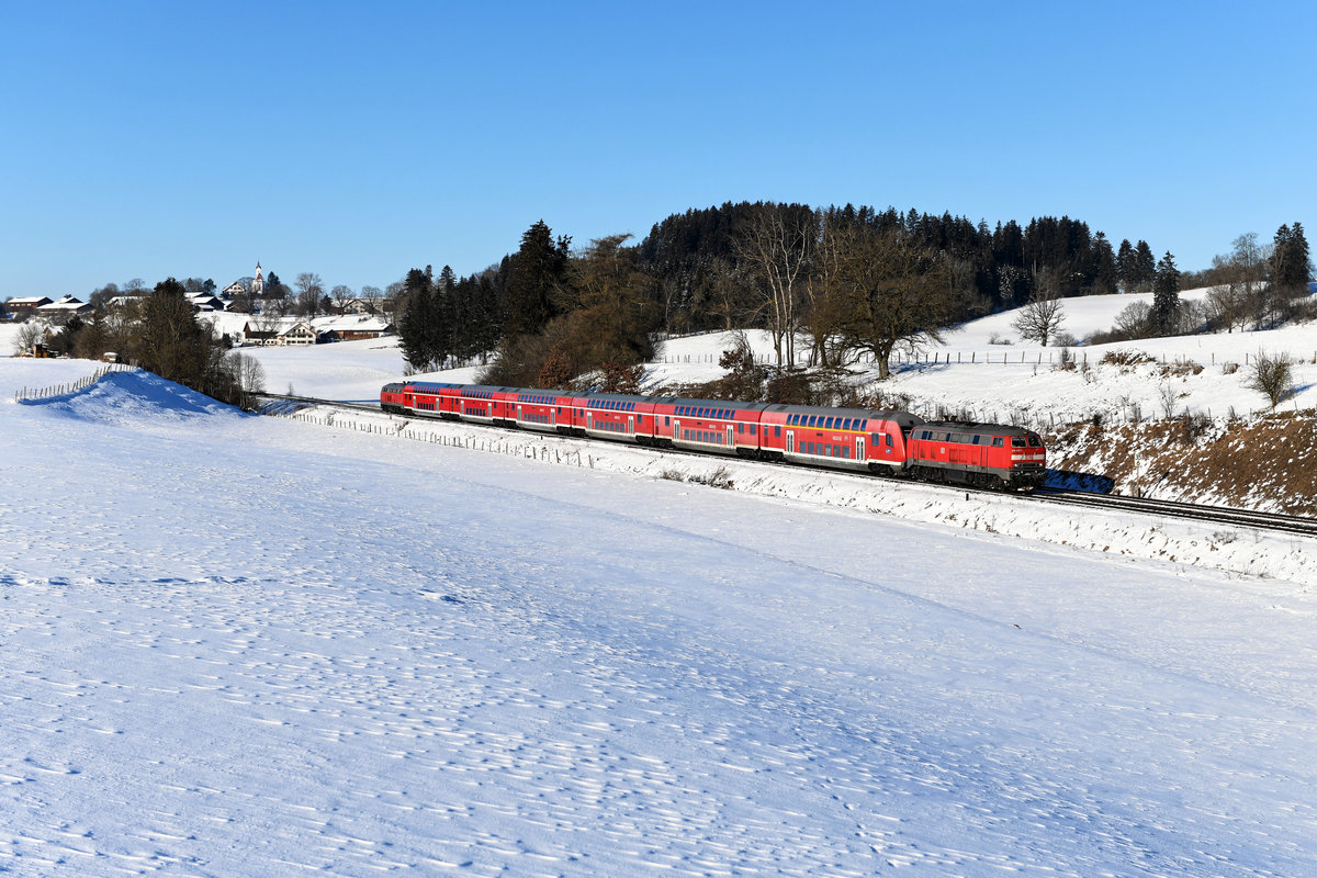 Auch nach Fahrplanwechsel kann die Baureihe 218 noch täglich auf der Allgäubahn beobachtet werden. Planmäßig pendelt eine Doppelstockwagen-Garnitur in Sandwichbespannung zwischen Oberstdorf und der bayerischen Landeshauptstadt. An Wochenenden verkehrt der RE 3893 nach München HBF lichttechnisch recht fotogen. Am 13. Februar 2021 konnte ich den Zug bei Aitrang aufnehmen. Es führte die 218 414, am Zugschluss arbeitete die 218 415. Im Hintergund erkennt man die kleine Ortschaft Görwangs mit der Kirche St. Albarn. Christoph Schneider
