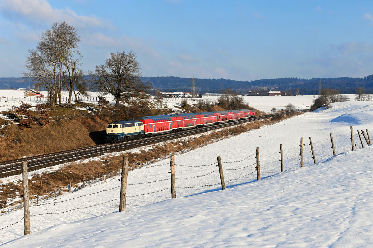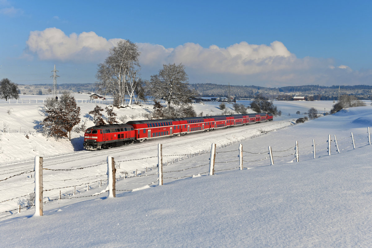 Auch nach Fahrplanwechsel kann die Baureihe 218 noch täglich auf der Allgäubahn beobachtet werden. Planmäßig pendelt eine Doppelstockwagen-Garnitur in Sandwichbespannung zwischen Oberstdorf und der bayerischen Landeshauptstadt. An Wochenenden verkehrt der RE 57588 nach Kempten lichttechnisch recht fotogen. Am 16. Januar 2021 sollte der Zug im üppig gefallenen Neuschnee umgesetzt werden. Entgegen der Wetterprognose zeigte sich der Tag aber doch recht wolkig, so daß bei Durchfahrt des Zuges bei Aitrang die Spannung stieg, ob es sich mit einem Sonnenbild ausgehen würde. Wie man sieht, tat es das und die führende 218 414 und die sechs Doppelstockwagen wurden schön ausgeleuchtet. Nur die 218 415 am Zugschluss war leicht im Schatten.