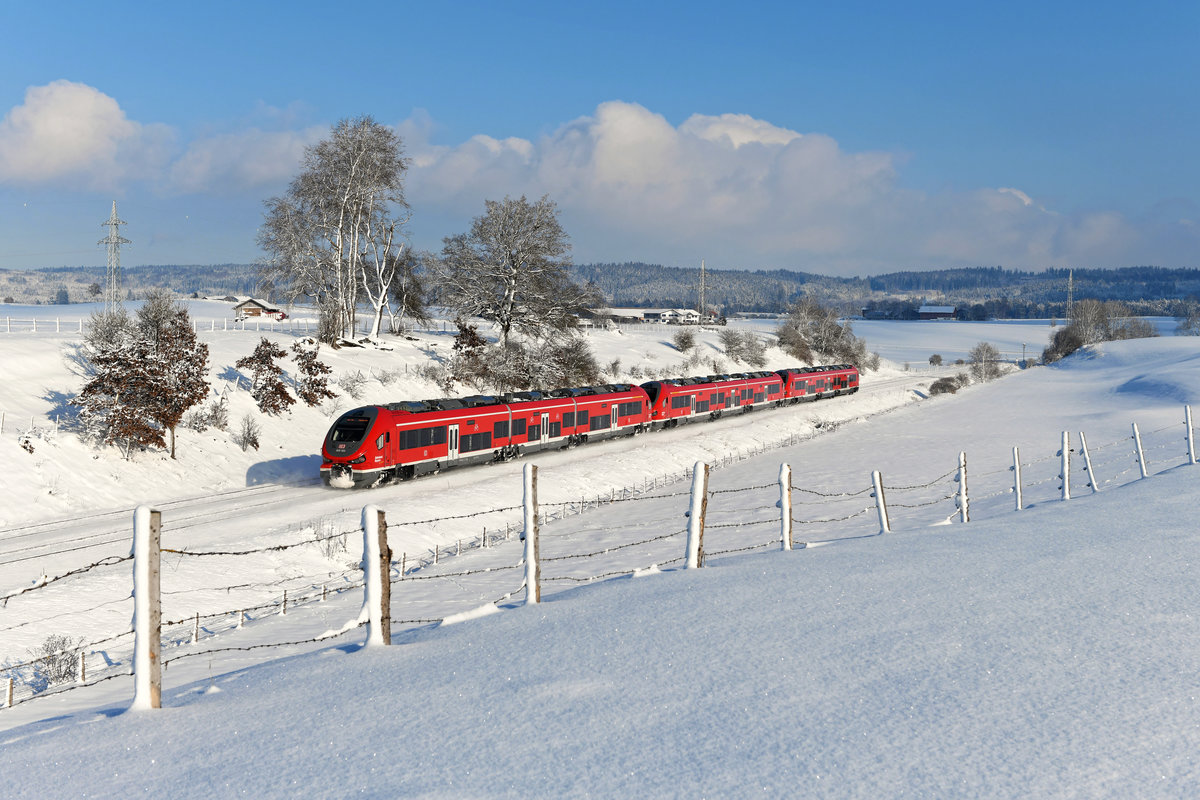 Die Sorgenkinder des BW Kempten sind die neuen Triebwagen der Gattung Pesa Link. Der Start des Einsatzes im Allgäu verlief recht holprig und häufige Zugausfälle waren an der Tagesordnung. Die markant gestylten Fahrzeuge haben bereits Spitznamen erhalten. Die respektvolle Version ist "Hai", die despektierliche "Klodeckel". Am 16. Januar 2021 konnte ich bei Aitrang einen Nachschuss auf den RE 57585 auf der Fahrt nach München HBF anfertigen. Gebildet war der Zug aus dem 633 033 und zwei weiteren Fahrzeugen des Typs. Eine Lücke in der Wolkendecke ermöglichte ein gut ausgeleuchtetes Winterbild. Christoph Schneider