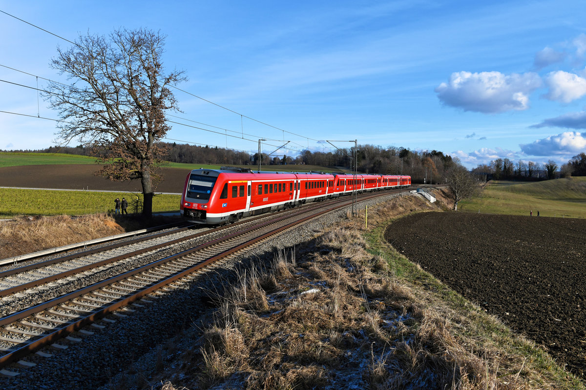 Und so sehen die Nachfolger der Alex-Züge auf der Allgäubahn aus: Es sind die wohlbekannten Neigetechnik-Triebwagen der Baureihe 612 von DB Regio. Am 26. Dezember 2020 konnte ich bei Kottgeisering exemplarisch den 612 080 vor zwei weiteren Triebwagen des selben Typs als RE 3878 nach Lindau Inselbahnhof bei Kottgeisering dokumentieren. Christoph Schneider