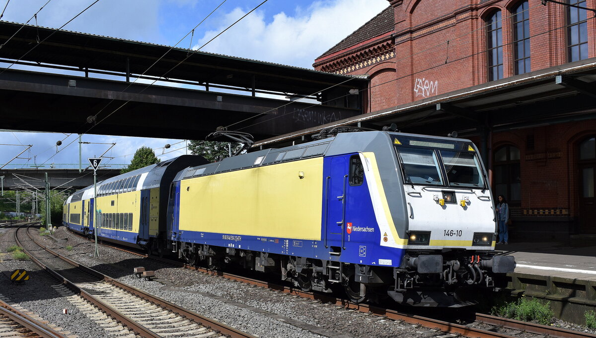 Metronom Eisenbahngesellschaft mbH, Uelzen [D] mit ihrer "146 515" [NVR-Nummer: 91 80 6146 515-2 D-BTH] und de RE4 nach Bremen bei der Einfahrt Bahnhof Hamburg-Harburg, 21.05.24 Lothar Stöckmann