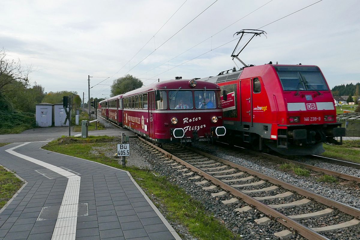 Die SBB GmbH und der Landkreis Konstanz feierten am 12.10.2019 das Jubiläum „25 Jahre seehas“. Anläßlich dieses Jubiläums verkehrten zusätzlich zum „seehas“ historische Sonderzüge. An der Haltestelle Hegne fährt ungeplant/ungewollt die Schwarzwaldbahn ins Bild, als sich die dreiteilige Schienenbusgarnitur  Roter Flitzer  als 832267 auf der Fahrt von Engen nach Konstanz befindet.