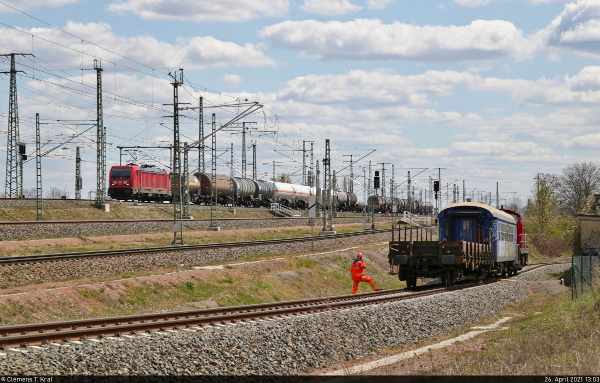 Jene Wagen, die "Herr Meyer" alias 151 079-1 zum Bahnhof Röblingen am See brachte, sieht er nun an sich vorbeiziehen. In ihnen befindet sich Abraum von der Großbaustelle am Stuttgarter Hauptbahnhof, der in den Romonta-Bergbau Amsdorf gekippt wird.