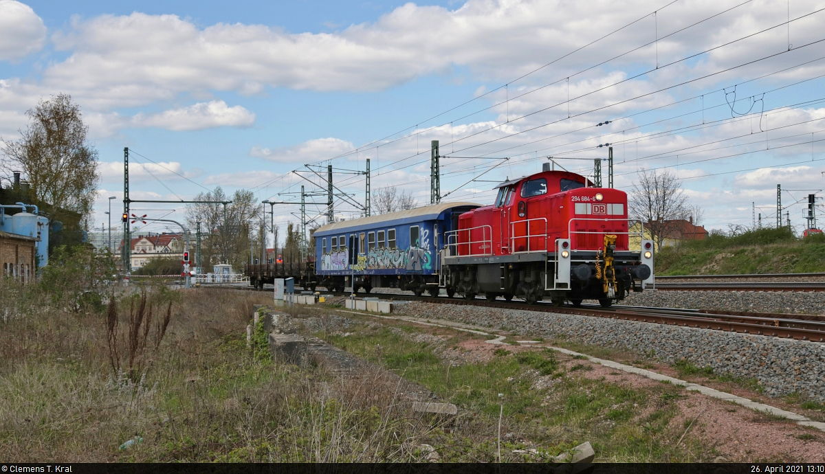 Im Bahnhof Angersdorf auf Gleis 4 hat sich 294 738-0 (294 238-1 | 290 238-5 | DB V 90) an das andere Ende der drei Schüttgutwagen gesetzt, die sie hierher brachte. In Kürze wird sie zur Zugbildungsanlage (ZBA) Halle (Saale) zurückkehren.