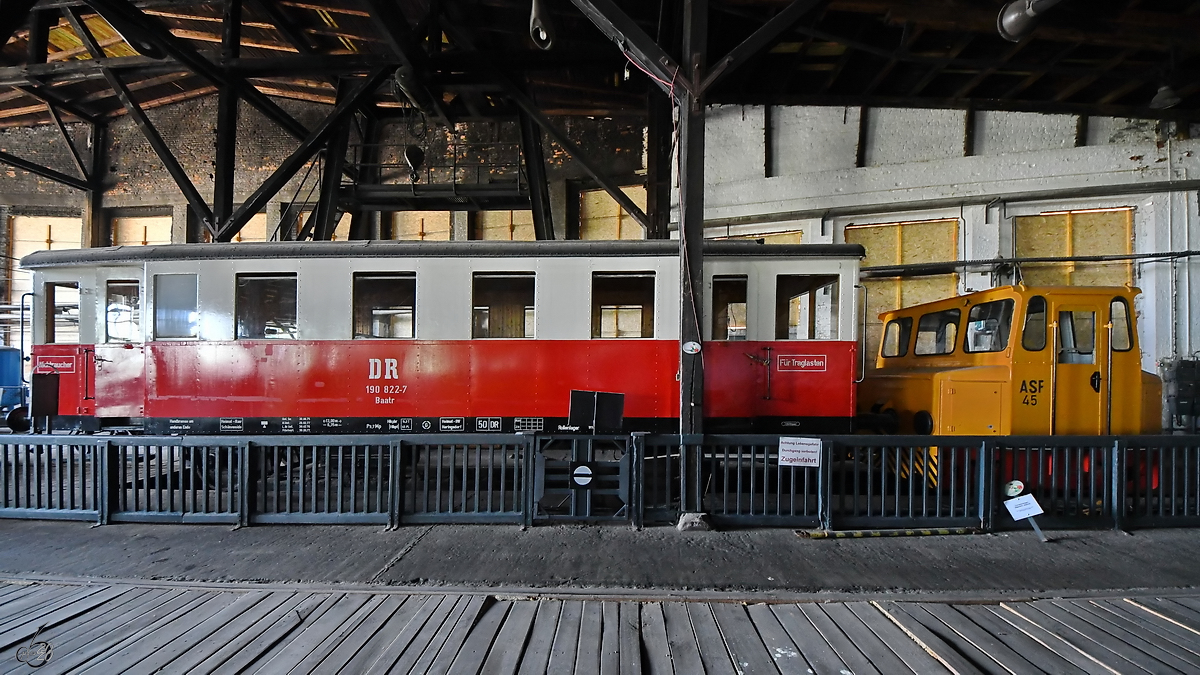 Das Akkuschleppfahrzeug ASF 45 (13212), Typ EL16 und der ehemalige Dampftriebwagen DT 15 "Stettin" (190 822) waren Mitte Juni 2020 im Lokschuppen Pomerania in Pasewalk ausgestellt. Christian Bremer