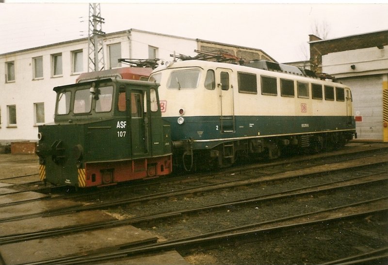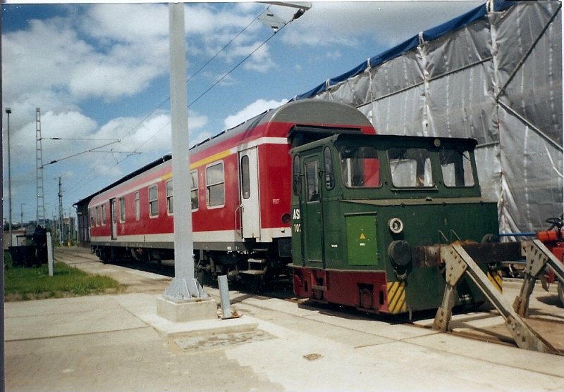 Nach der Schließung des Bh Stralsund gelangte das Akkuschleppfahrzeug (ASF) 101 zum Bh Rostock und ist an der dortigen Wagenhalle für den Verschub von Reisezugwagen zuständig.Die Aufnahme entstand an einem Sonntag im Juni 2001 als das ASF 101 nicht viel zutun hatte. Mirko Schmidt