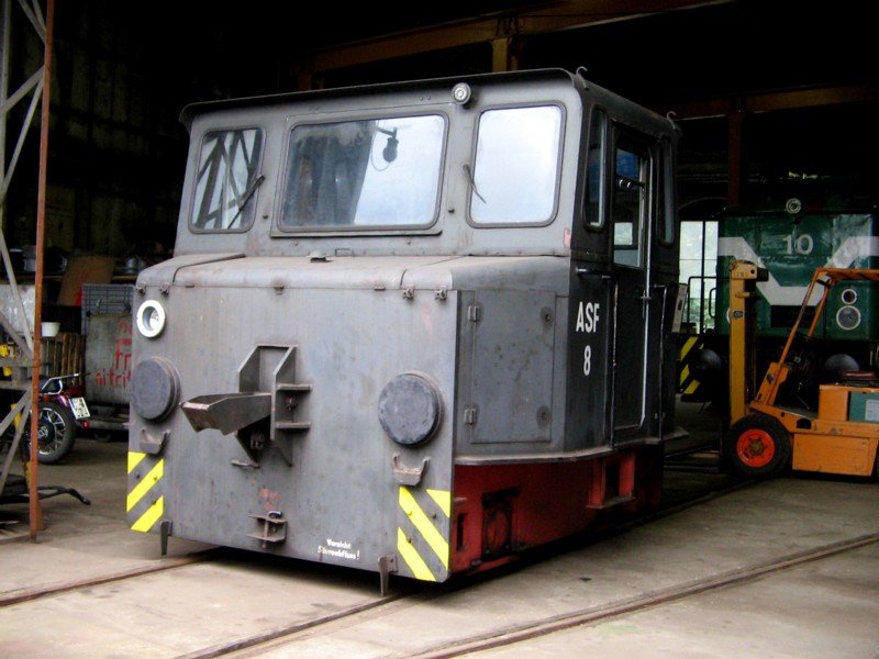 Das Akkuschleppfahrzeug ASF48 steht heute arbeitslos im Lokschuppen II des Bw Falkenberg(Elster) unterer Bahnhof. Er soll einmal Bestandteil der dortigen Fahrzeugausstellung werden, wenn die Bahn den Lokschuppen zu einem erschwinglichen Preis an das Brandenburgische Eisenbahnmuseum Falkenberg übergibt. Hier konnte er beim Bahnhofsfest betrachtet werden, 26.09.04. Harald Neumann
