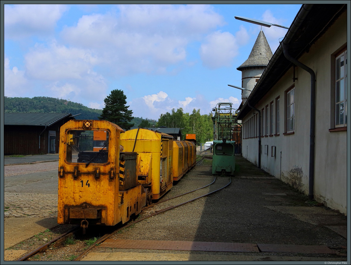 Lok 14 (EL 9) kommt vor dem Besucherzug des Besucherbergwerks Rammelsberg zum Einsatz. Der erste Wagen ist ein Eigenbau des Museums, um auch Rollstuhlfahrern der Besuch zu ermöglichen. (Goslar, 21.07.2019) Christopher Pätz