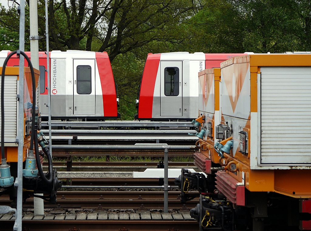 Sonntagsruhe: insgesamt sechs Akkuloks der Hamburger Hochbahn stehen auf der Abstellanlage "Saarlandstraße". 12.5.2013 (Alle Bilder vom öffentlich zugängigen Gelände eines Autohändlers fotografiert) ukamp