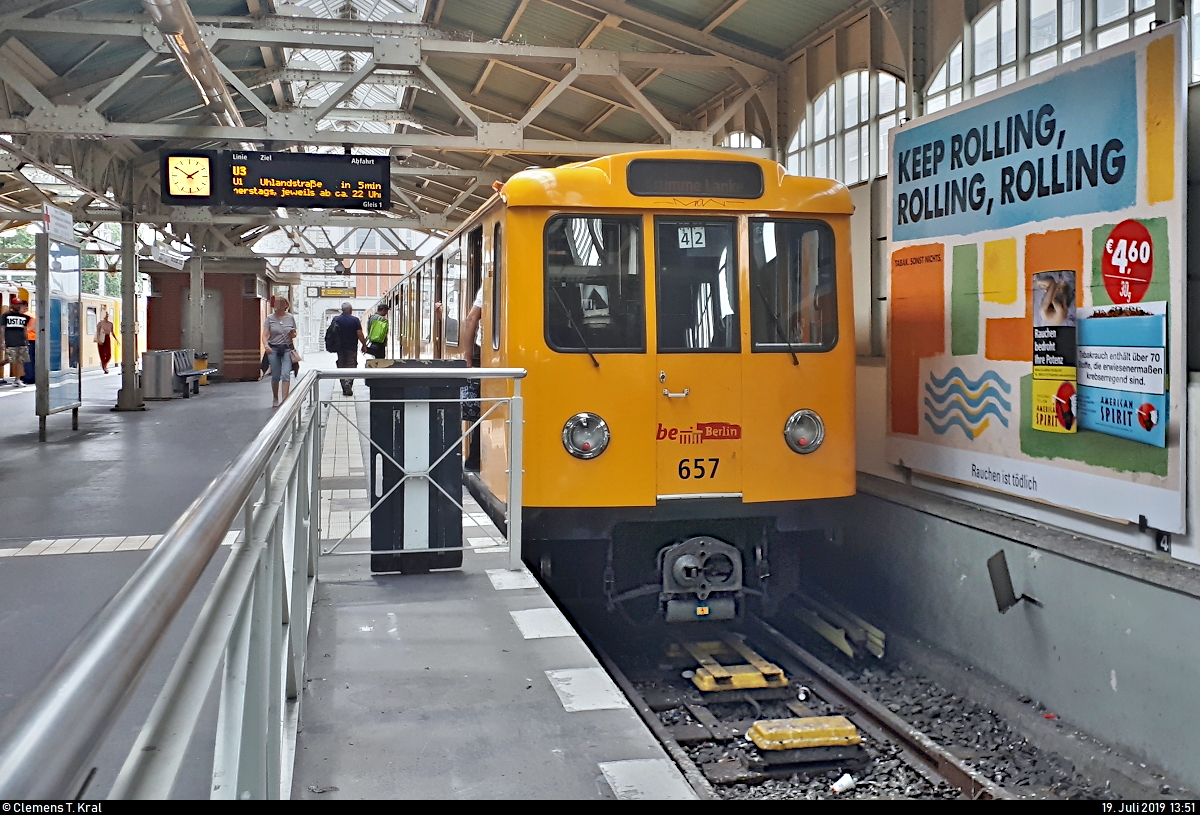 Smartphone-Aufnahme von Baureihe A3L 71, Wagen 657 und Wagen ???, der Berliner Verkehrsbetriebe (BVG) als U3 nach Berlin Krumme Lanke, die in ihrem Startbahnhof Berlin Warschauer Straße auf Gleis 1 stehen.