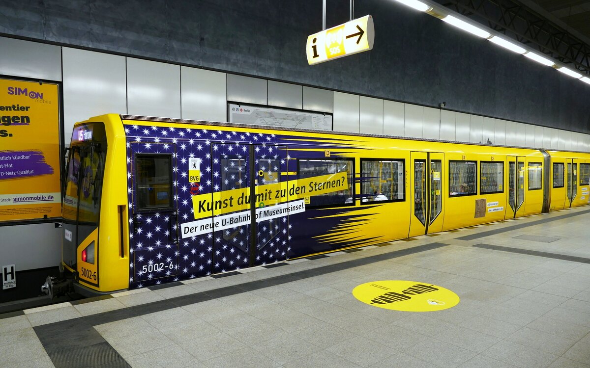 BVG Berlin mit H-Zug Tw '5002-6', fährt aktuell mit einer Sonderbeklebung ''Kunst du mit zu den Sternen?'', anlässlich der Eröffnung des neuen Bahnhofs ''Museumsinsel'' auf der U5. Berlin - Hbf im Juli 2021. Lugi