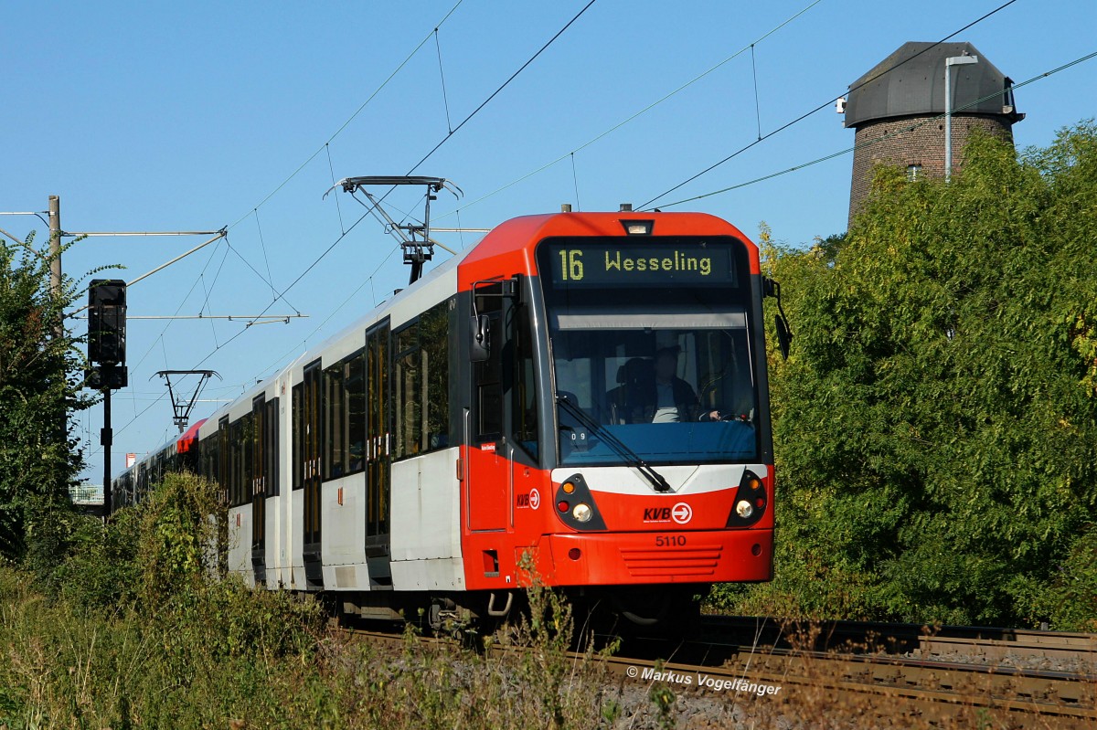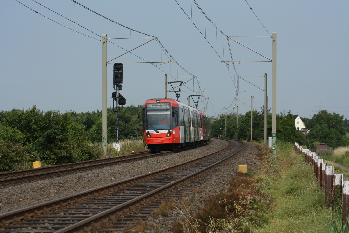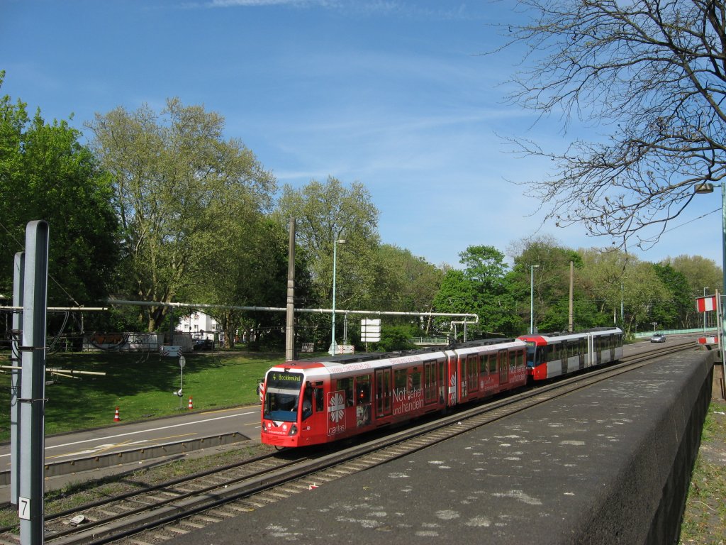 Am 4.8.12 konnte ich TW 5133 (vorne) und TW 5??? (hinten) unterwegs als Linie 4 Richtung Bocklemünd nördlich der Haltestelle "Im Weidenbruch" auf der Brücke über die BAB 3 bildlich festhalten. Johannes Schwarz